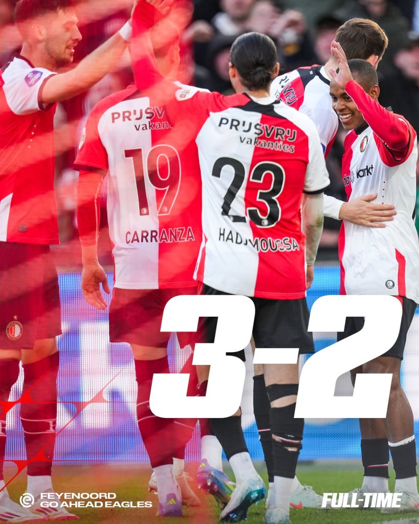 Στο κυνήγι της δεύτερης θέσης παραμένει η Φέγενορντ, μετά το 3-2 επί της Γκόου Αχέντ Ίγκλις. Στο 33ο λεπτό, η ομάδα του Ρότερνταμ άνοιξε το σκορ, με την εύστοχη εκτέλεση πέναλτι του Γιάκουμπ Μόντερ, με την Γκόου Αχέντ Ίγκλις να ισοφαρίζει, στις καθυστερήσεις του ημιχρόνου, με τον Βίκτορ Έντβαρντσεν. Δέκα λεπτά μετά την έναρξη της επανάληψης, η Φέγενορντ πήρε, ξανά, προβάδισμα, με γκολ του Χαντζ Μούσα, αλλά, και πάλι οι φιλοξενούμενοι είχαν απάντηση. Στο 61ο λεπτό, ο Όλιβερ Άντμαν έκανε το 2-2, για να έρθει ο Παισάο να δώσει τη λύση στη Φέγενορντ. Ο Βραζιλιάνος ακραίος φορ έκανε το 3-2 στο 74ο λεπτό, με τη Φέγενορντ να έχει 50 βαθμούς, με ένα ματς λιγότερο από τη τρίτη Ουτρέχτη, που έχει 52 βαθμούς και από τη δεύτερη Αϊντχόφεν που έχει 58 βαθμούς. Υπενθυμίζεται ότι οι δυο πρώτες θέσεις οδηγούν, απευθείας, στη League Phase του Champions League.