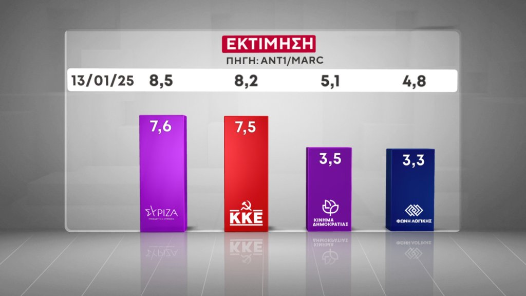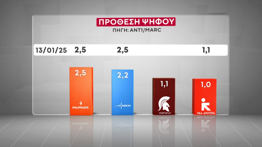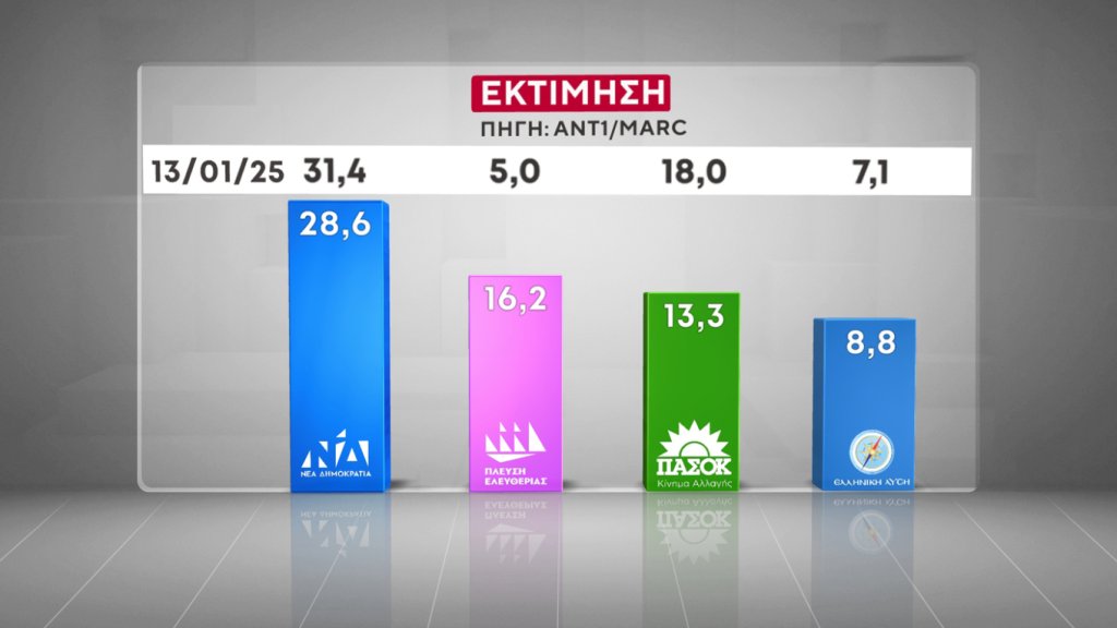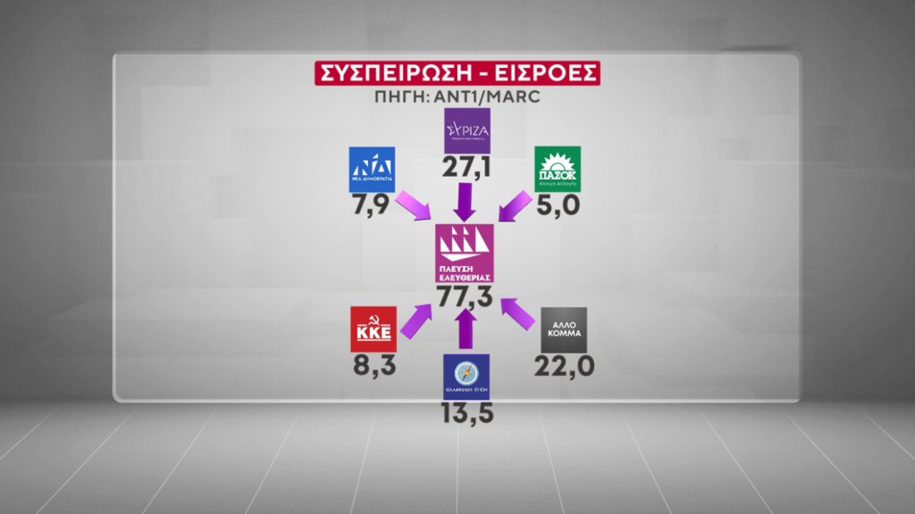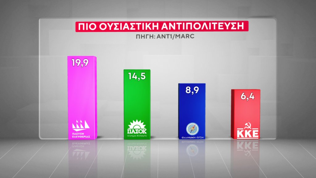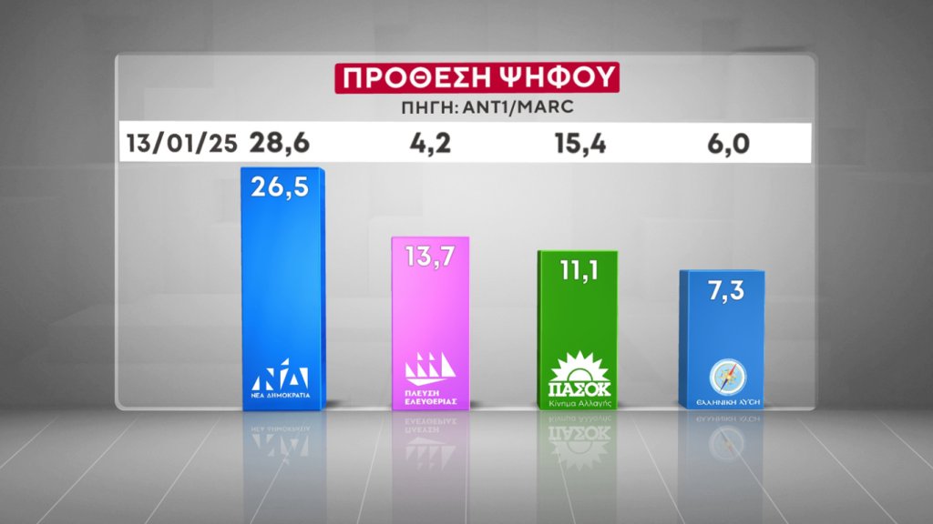 Συγκεκριμένα, σύμφωνα με τη σημερινή δημοσκόπηση της MARC για λογαριασμό του ANT1, η ΝΔ στην πρόθεση ψήφου είναι στο 26,5%, η Πλεύση Ελευθερίας 13,7%, το ΠΑΣΟΚ 11,1%, η Ελληνική Λύση 7,3%, ο ΣΥΡΙΖΑ 6,4%, το ΚΚΕ 6,3%, το Κίνημα Δημοκρατίας 2,8%, η Φωνή Λογικής 2,8%, το ΜέΡΑ25 2,5%, η Νίκη 2,2%, οι Σπαρτιάτες 1,1%, η Νέα Αριστερά 1%.