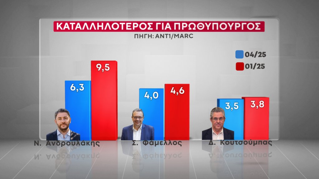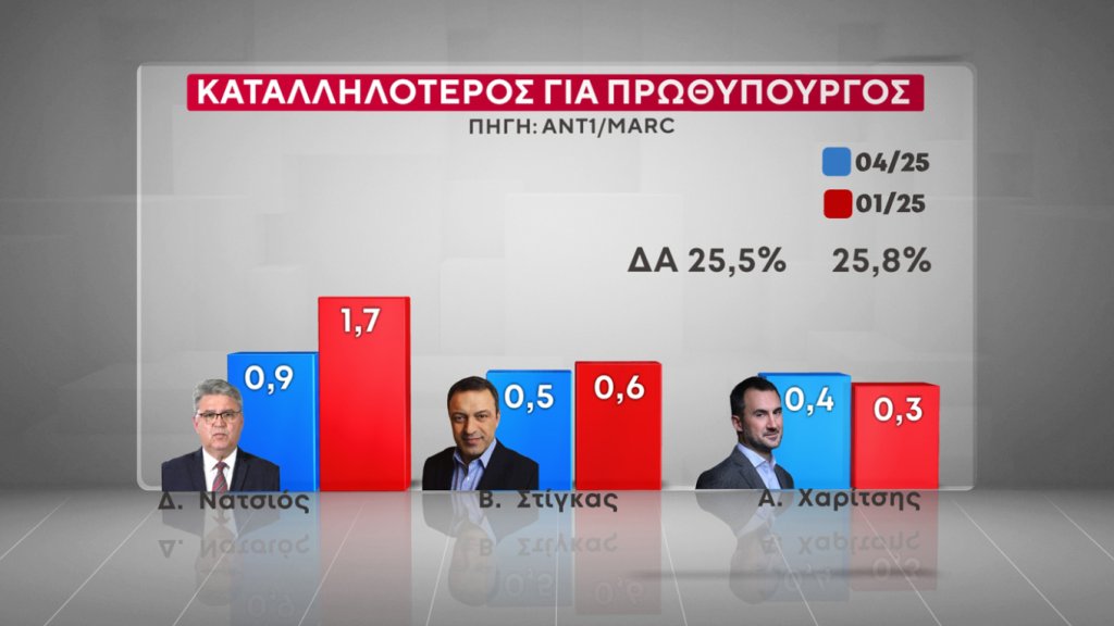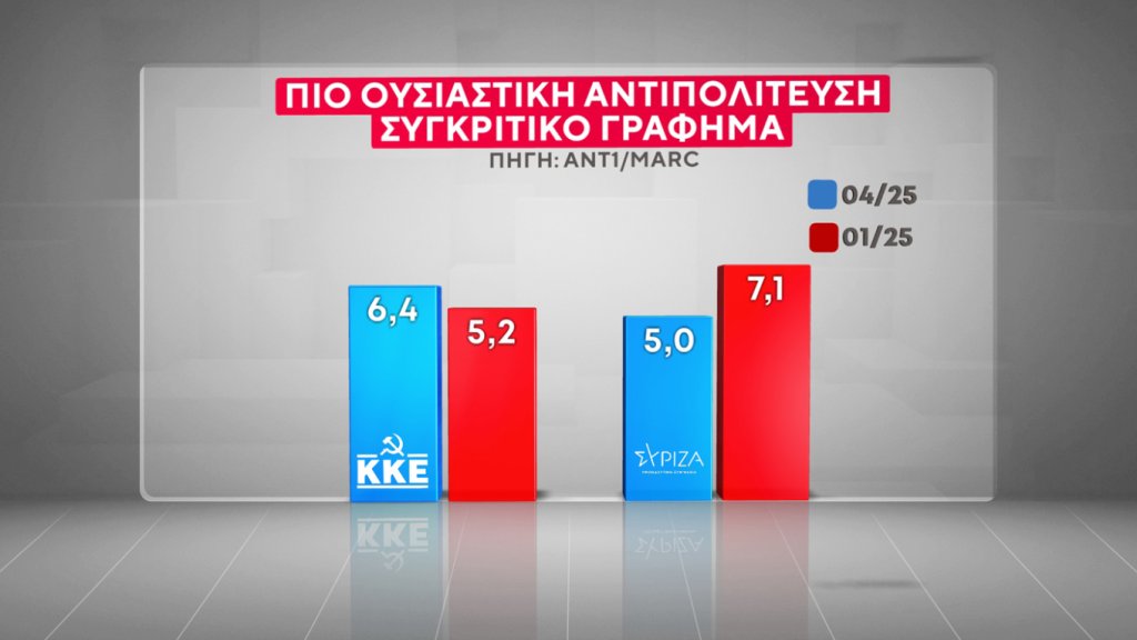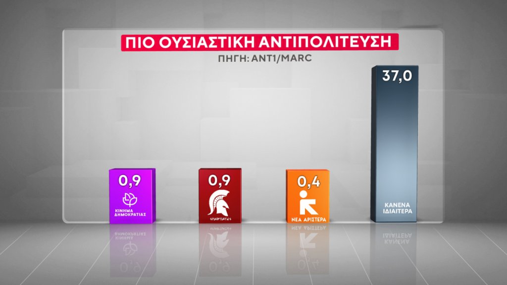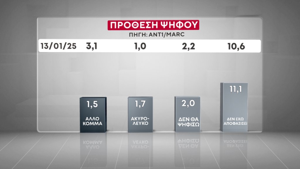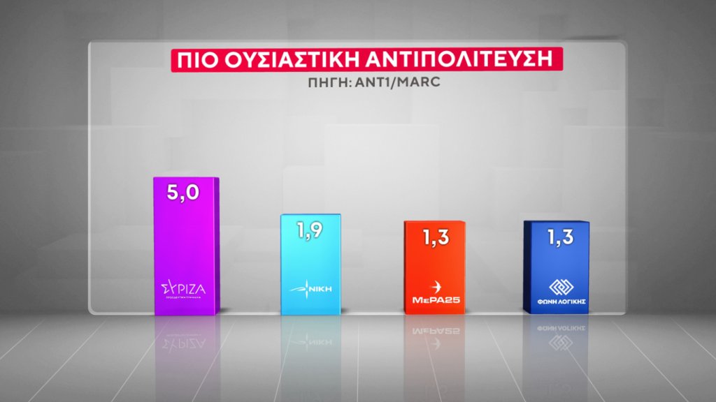 Συγκεκριμένα, σύμφωνα με τη σημερινή δημοσκόπηση της MARC για λογαριασμό του ANT1, η ΝΔ στην πρόθεση ψήφου είναι στο 26,5%, η Πλεύση Ελευθερίας 13,7%, το ΠΑΣΟΚ 11,1%, η Ελληνική Λύση 7,3%, ο ΣΥΡΙΖΑ 6,4%, το ΚΚΕ 6,3%, το Κίνημα Δημοκρατίας 2,8%, η Φωνή Λογικής 2,8%, το ΜέΡΑ25 2,5%, η Νίκη 2,2%, οι Σπαρτιάτες 1,1%, η Νέα Αριστερά 1%.