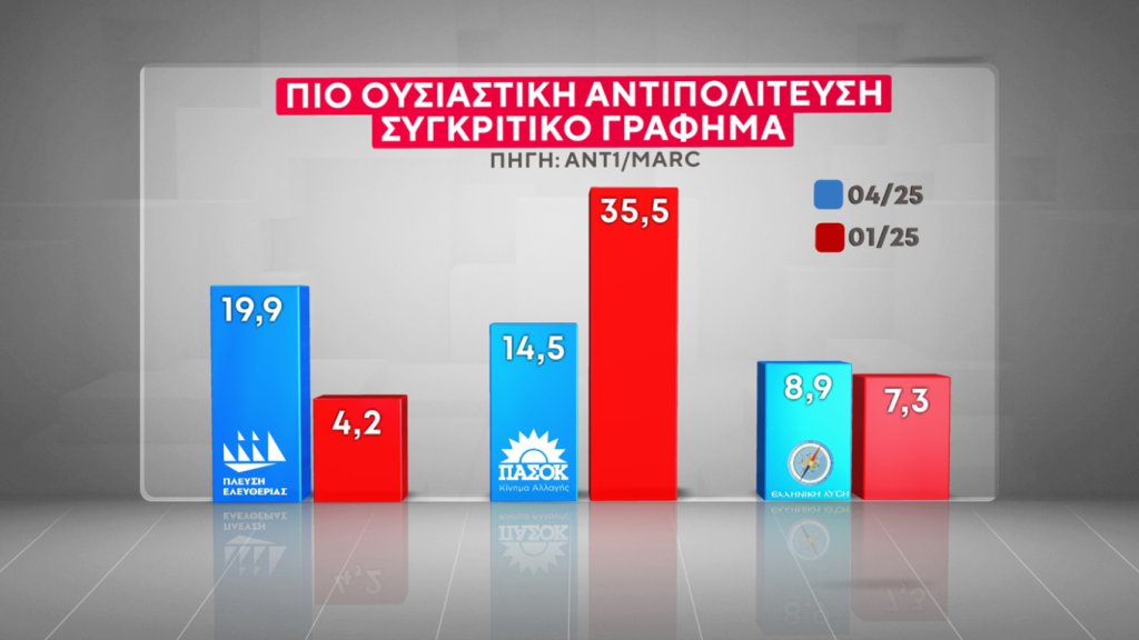 Όλα τα κόμματα πλην της Πλεύσης της Ελληνικής Λύσης, του ΜεΡΑ25 και της Νίκης εμφανίζουν πτώση σε σχέση με τον Ιανουάριο. Μάλιστα, η Πλεύση πενταπλασιάζει τις δυνάμεις της σε σχέση με τις εθνικές εκλογές του 2023. Η Πλεύση φαίνεται ότι παίρνει κυρίως από τον ΣΥΡΙΖΑ και την Ελληνική Λύση, αλλά εισπράττει από όλα τα κόμματα - ακόμα και από τη Νέα Δημοκρατία.