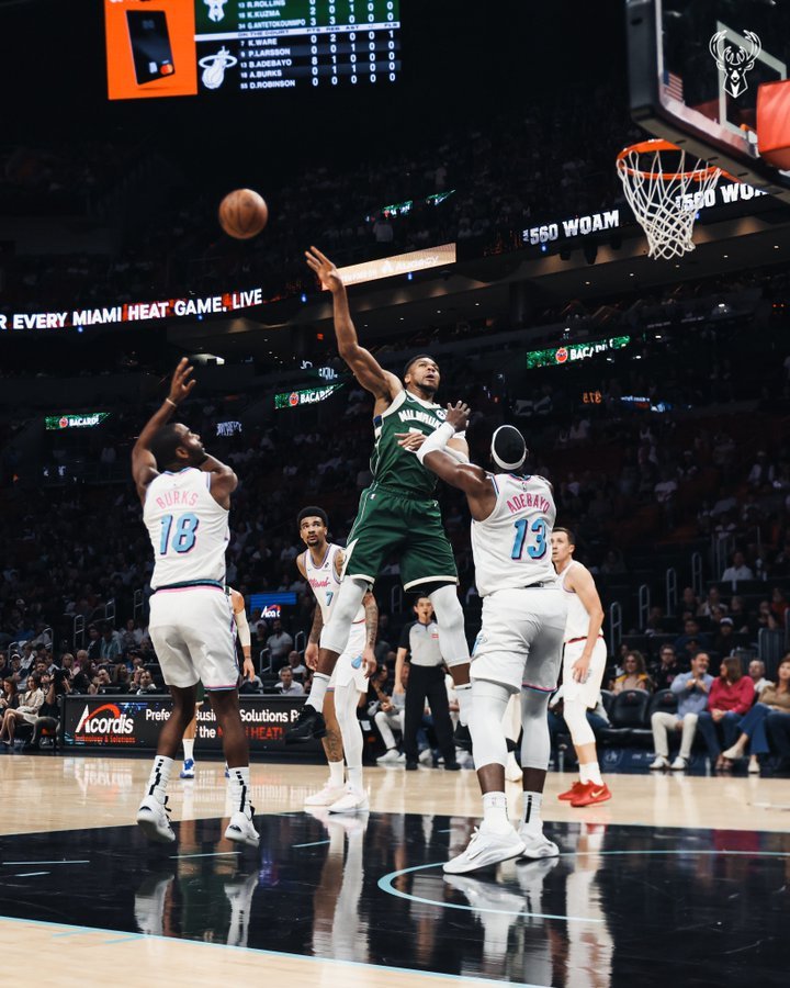 Λίγο πριν από τα μέσα της πρώτης περιόδου, στο Μαϊάμι Χιτ-Μιλγουόκι Μπακς, ο Γιάννης Αντετοκούνμπο, με ασύλληπτο τρόπο, πάσαρε στον Ράιαν Ρόλινς και εκείνος ευστόχησε σε σουτ τριών πόντων.