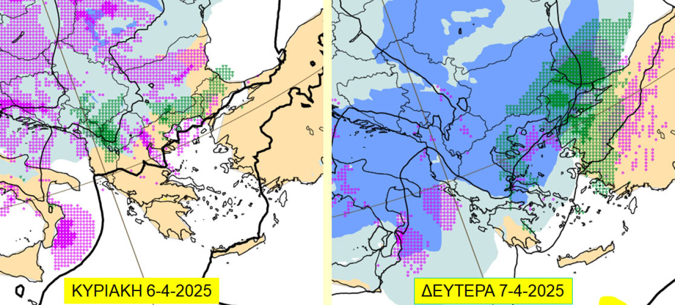 1. Από τη νύχτα της Κυριακής (06-04-2025) προς Δευτέρα (07-04-2025) και έως το μεσημέρι της Δευτέρας στα ορεινά και τα ημιορεινά της Θράκης και της Μακεδονίας (περιοχές με υψόμετρο από 400 μέτρα και πάνω) και τοπικά στο νομό Έβρου και σε πεδινές περιοχές.