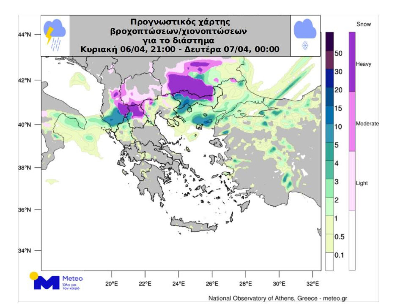 Χιονοπτώσεις αναμένονται από το βράδυ της Κυριακής 06/04 στα ορεινά της βόρειας χώρας και κατά τη διάρκεια της νύχτας προς το ξημέρωμα της Δευτέρας 07/04 στα ημιορεινά, αλλά και πρόσκαιρα σε περιοχές με χαμηλότερο υψόμετρο της Μακεδονίας και της Θράκης. Από τις πρώτες πρωινές ώρες της Δευτέρας 07/04 χιονοπτώσεις θα σημειωθούν και στα ορεινά και ημιορεινά τμήματα της Κεντρικής Ελλάδας. Ακόμα, βροχοπτώσεις θα εκδηλωθούν στο μεγαλύτερο μέρος της χώρας και σποραδικές καταιγίδες στα βορειοανατολικά, ενώ τα φαινόμενα θα αρχίσουν να εξασθενούν από το απόγευμα της Δευτέρας 07/04.