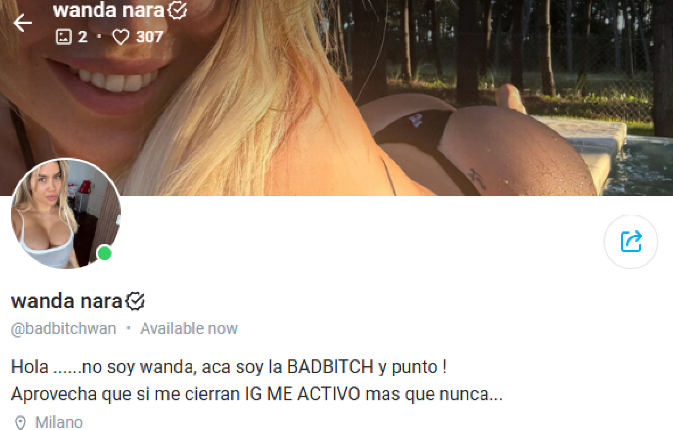 «Γεια... Δεν είμαι η Wanda, εδώ είμαι η BADBITCH και αυτό είναι! Εκμεταλλευτείτε το, γιατί αν κλείσουν το Instagram μου, θα φανώ πιο ενεργός από ποτέ», έγραψε η 38χρονη Γουάντα στην περιγραφή του πρώτου προφίλ της στο OnlyFans, όπου για να δείτε το περιεχόμενό της πρέπει να εγγραφείτε ξεκινώντας από 19,98 δολάρια το μήνα.