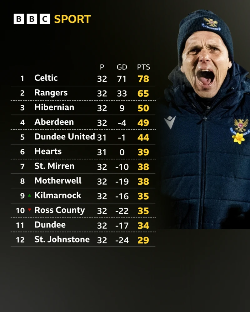 Ένα τρίποντο που φέρνει τους γηπεδούχους πέντε βαθμούς πίσω από την προτελευταία Νταντί, έξι αγωνιστικές πριν το φινάλε. Όσο για τη Σέλτικ, χρειάζεται νίκη την επόμενη αγωνιστική, κόντρα στη Κιλμάρνοκ για να στεφθεί πρωταθλήτρια Σκωτίας για 13η φορά τις 14 τελευταίες σεζόν.