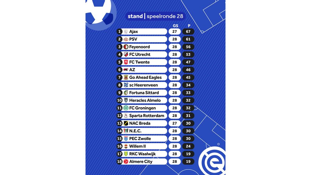 Η Ουτρέχτη παραμένει η μοναδική αήττητη ομάδα, μακριά από την έδρα της, στο εφετινό πρωτάθλημα, με οκτώ νίκες και έξι ισοπαλίες. Για την 28η αγωνιστική, στο De Adelaarshorst, επέστρεψε από το 2-0, κόντρα στην Γκόου Αχέντ Ίγκλις, πήρε τον βαθμό και παραμένει στη τέταρτη θέση που οδηγεί στο Europa League. Στόχος της, ωστόσο, η τρίτη θέση και τα προκριματικά του Champions League.