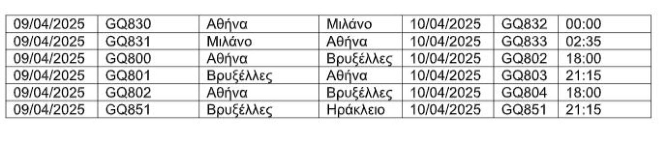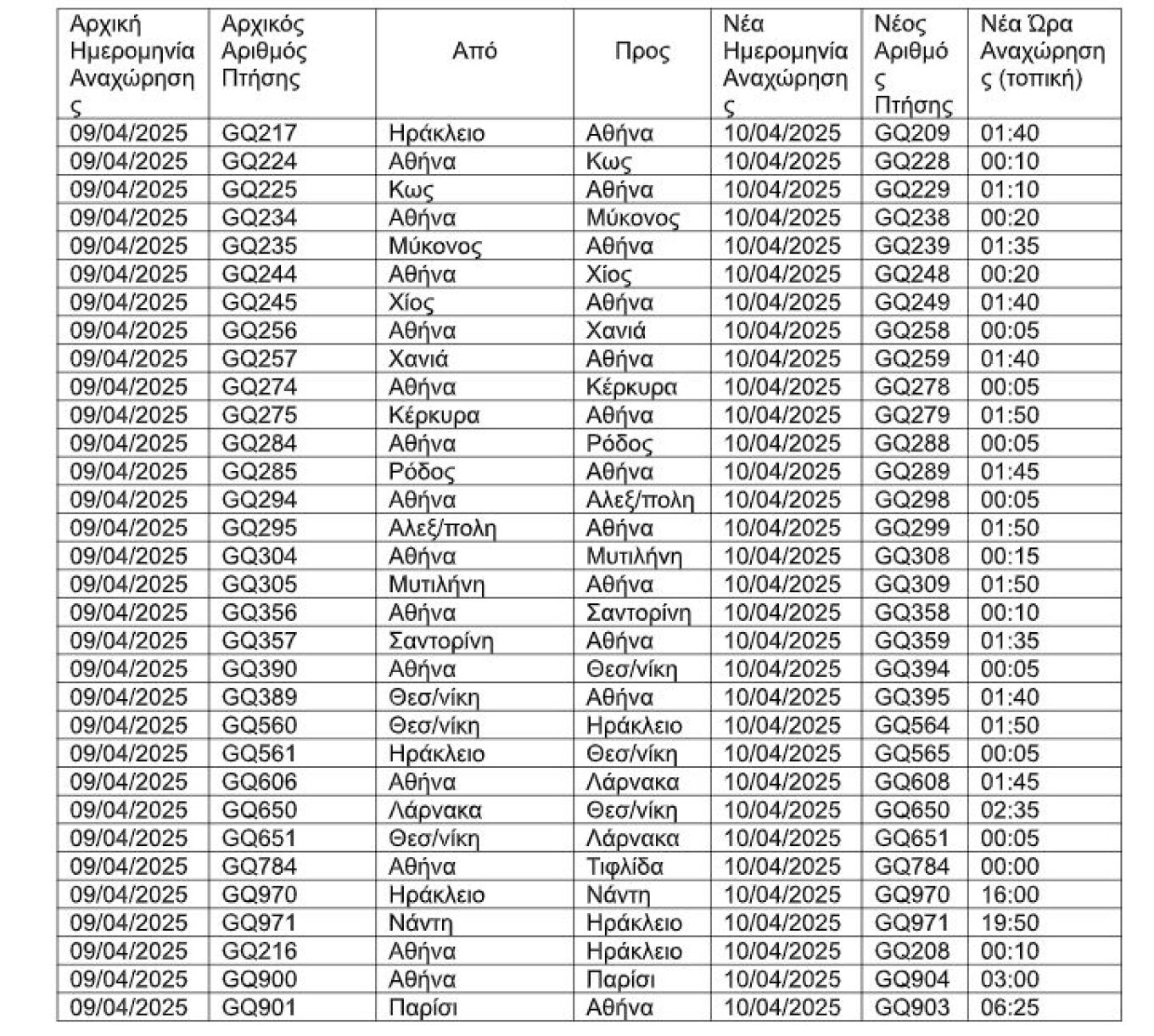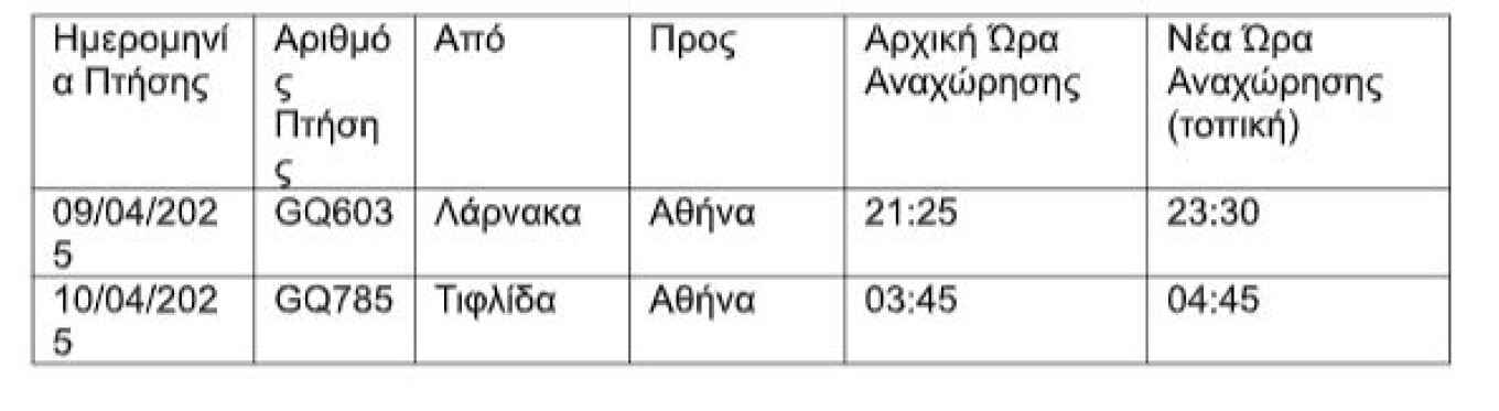 Συγκεκριμένα, όλες οι προγραμματισμένες πτήσεις στις 9 Απριλίου 2025 ακυρώνονται, εκτός από τις παρακάτω οι οποίες θα πραγματοποιηθούν με τις εξής τροποποιήσεις: