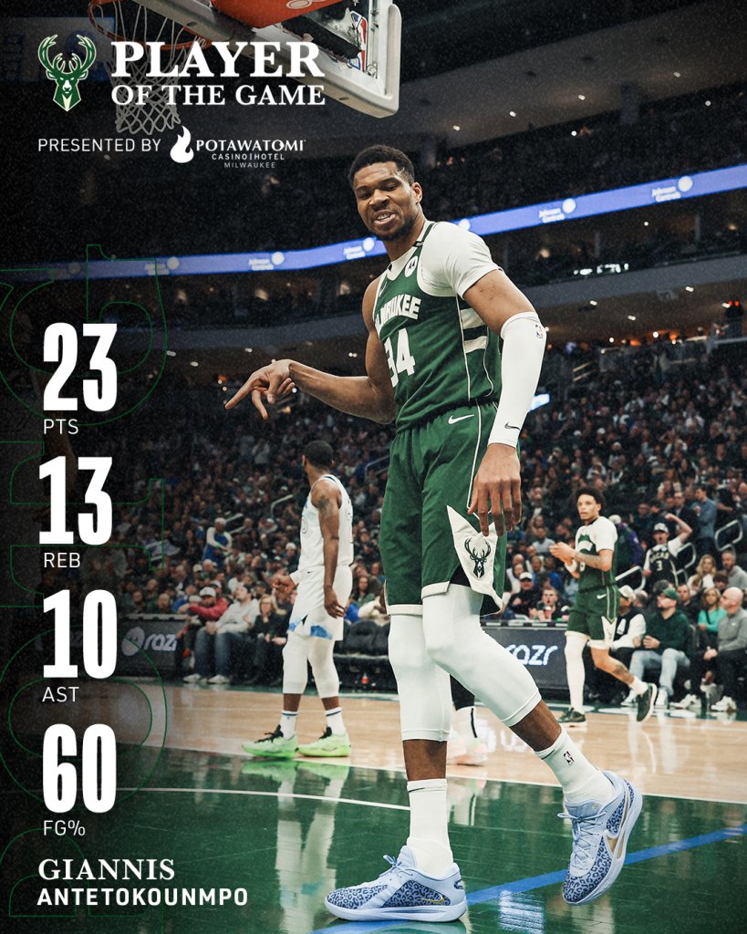 Ο Γιάννης έκανε σχεδόν τα πάντα κόντρα στην Μινεσότα, τελειώνοντας τον αγώνα; με 23 πόντους με 9/15 σουτ (1/2 τρίποντα), 4/11 βολές, 13 ριμπάουντ, 10 ασίστ, 1 κλέψιμο, 1 κόψιμο και κανένα λάθος σε 38 λεπτά συμμετοχής.