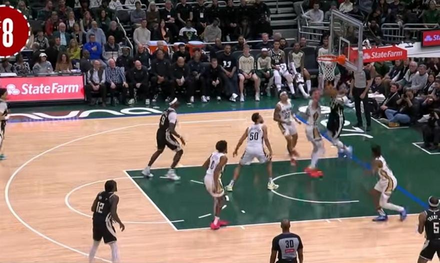 Ο Γιάννης Αντετοκούνμπο πέτυχε νταμπλ-νταμπλ, στη νίκη των Μπακς επί των Πέλικανς, και το ακροβατικό του λέι απ βρίσκεται στην όγδοη θέση του σημερινού NBA Top-10. Στην κορυφή είναι το poster κάρφωμα του Τζέιλεν Ντουρέν των Πίστονς.