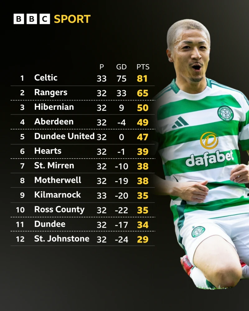 Η Σέλτικ βρίσκεται μια ανάσα από το 13ο πρωτάθλημα, στις 14 τελευταίες σεζόν. Η πρωτοπόρος υποδέχτηκε την Κιλμάρνοκ, επιβλήθηκε 5-1 και θα "κλειδώσει" τον τίτλο της πρωταθλήτριας Σκωτίας, εάν την Κυριακή η Ρέιντζερς ηττηθεί από την Αμπερντίν. Διαφορετικά, με νίκη την επόμενη αγωνιστική, η Σέλτικ παίρνει το πρωτάθλημα.