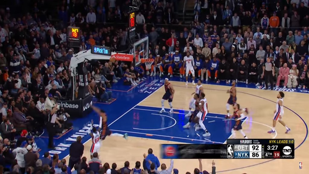 Με μεγάλο πρωταγωνιστή τον Κέιντ Κάνινγκχαμ, ο οποίος σκόραρε 33 πόντους και μάζεψε 12 ριμπάουντ, οι Πίστονς κατάφεραν να επικρατήσουν 100-94 των Νικς και να πετύχουν την πρώτη τους νίκη σε postseason μετά από 17 χρόνια, ισοφαρίζοντας σε 1-1 τη μεταξύ τους σειρά στα playoffs του NBA.