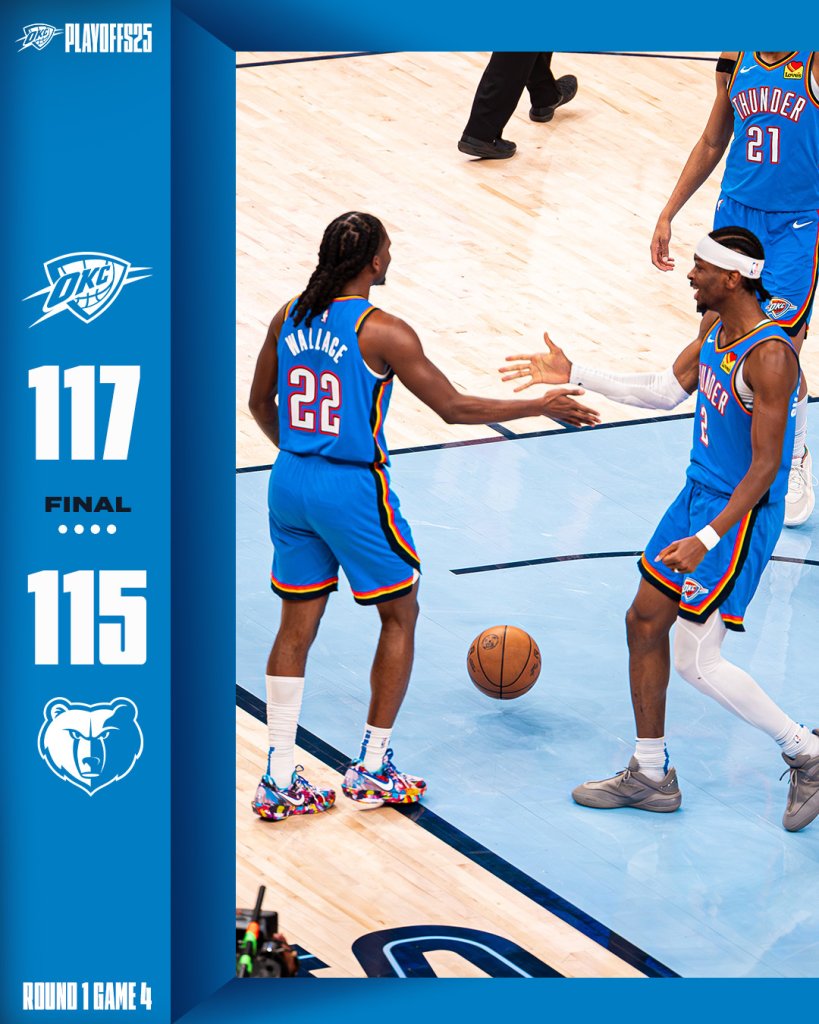 Η Οκλαχόμα Σίτι Θάντερ "σκούπισε" τη σειρά με τους Γκρίζλις, αφού, μετά από ένα συναρπαστικό παιχνίδι στο Μέμφις, νίκησε 117-115 και έκανε το 4-0.