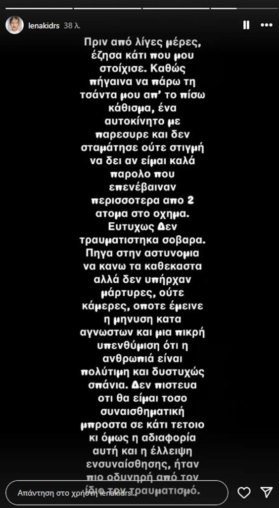 Η ηθοποιός Λένα Δροσάκη αποκάλυψε μέσα από τον λογαριασμό της στο Instagram ότι πριν από μερικές ημέρες έπεσε θύμα παράσυρσης από οδηγό, ο οποίος δεν σταμάτησε στο σημείο.