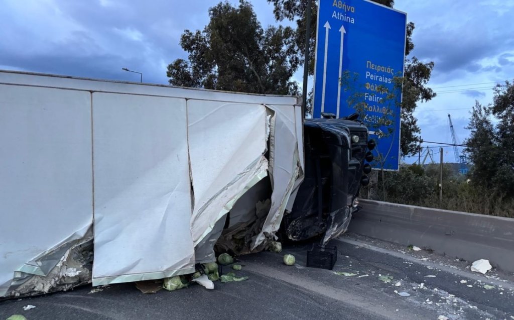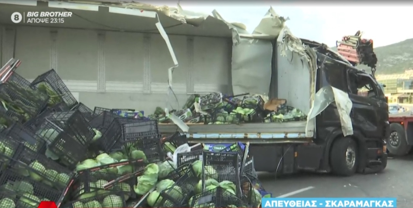 Λίγο μετά τις 5:15 το πρωί, σημειώθηκε τροχαίο ατύχημα όταν μια νταλίκα αναποδογύρισε στην εθνική οδό Αθηνών-Κορίνθου στο ύψος του Σκαραμαγκά.