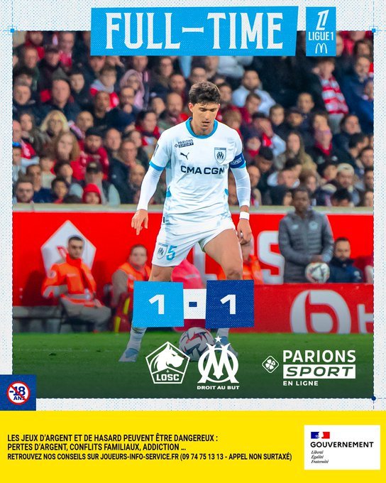 Σε ένα πολύ κακό παιχνίδι στην έδρα της Λιλ η ομώνυμη ομάδα έμεινε στο 1-1 με τη Μαρσέιγ. Έτσι, καμία ομάδα δεν κατάφερε να ξεμακρύνει στη μάχη για το επόμενο Τσάμπιονς Λιγκ.