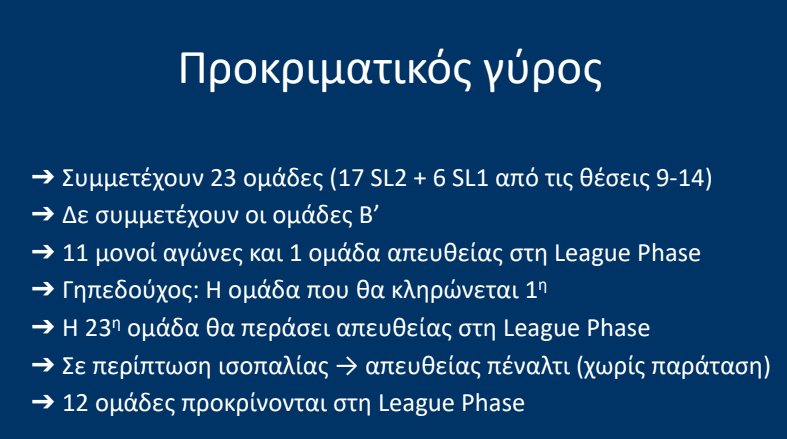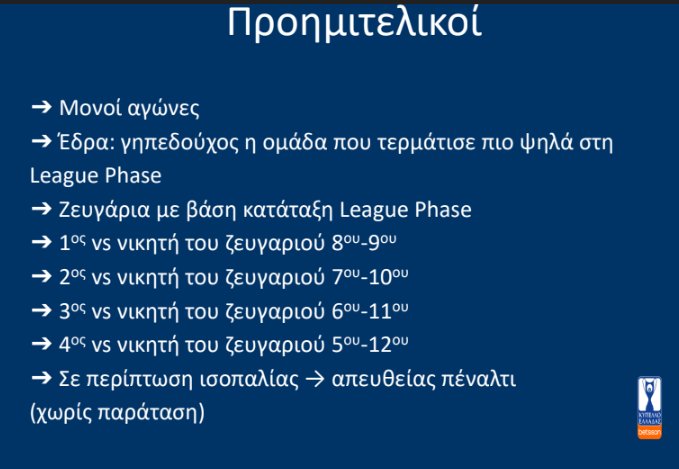 Βέβαια με αυτό τον τρόπο μειώνονται οι πιθανότητες για μικρομεσαίες ομάδες να είναι τυχερές και να τους κάτσει ένα μονοπάτι μέχρι τον τελικό χωρίς να πέσουν προηγουμένως πάνω σε κάποιον μεγάλο. Όπως έγινε με τον ΟΦΗ φέτος ας πούμε. Πρακτικά, εφόσον οι 4 μεγάλοι καταλάβουν τις 4 πρώτες θέσεις της League Phase, συναντιούνται μόνο στους ημιτελικούς. Όλα αυτά δείχνουν ότι μειώνονται οι πιθανότητες στο όνειρο για τους μικρούς και (προφανώς) αυτό γίνεται στον βωμό των τηλεοπτικών εσόδων. Οπότε... ΣΥΝΕΧΕΙΑ διερωτώμαι, ενδιαφέρον είναι το νέο φορμάτ, σωστό και δίκαιο, ως προς την φιλοσοφία που πρέπει να λειτουργεί ο θεσμός του Κυπέλλου, είναι?