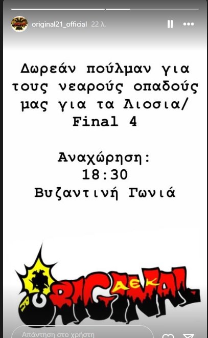 Όπως πάντα σε ματς της ΑΕΚ στα Λιόσια, έτσι και τώρα για τον ημιτελικό με τη Μάλαγα, η ORIGINAL 21 βάζει δωρεάν πούλμαν για τους νεαρούς φίλους της ομάδας.