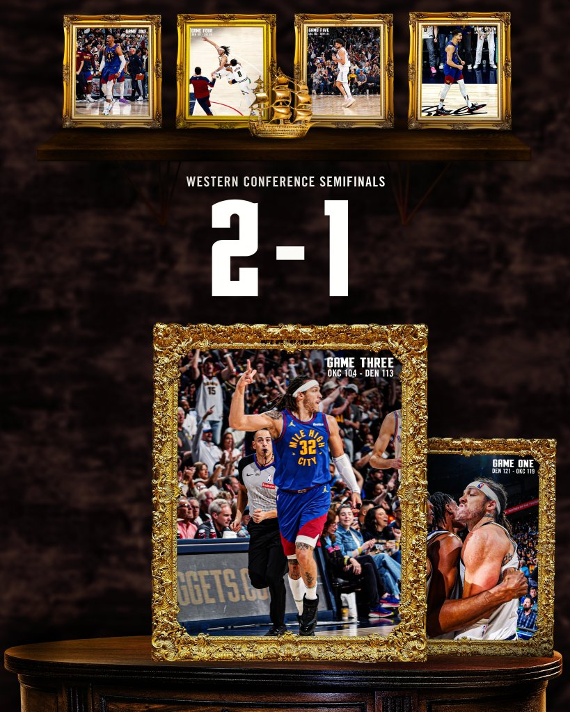 Σε ολόκληρη την κανονική διάρκεια του Game 3, οι Νάγκετς δεν προηγήθηκαν ποτέ με διαφορά μεγαλύτερη των δυο πόντων. Όμως, στην παράταση, η ομάδα του Ντένβερ έκανε επιμέρους 11-2, νίκησε 113-104 την Οκλαχόμα Σίτι Θάντερ και, πλέον, προηγείται 2-1 στη σειρά των ημιτελικών της Δύσης. Όπως στο Game 1, ο Άαρον Γκόρντον έσωσε την παρτίδα για τους Νάγκετς, αφού δικό του τρίποντο έστειλε το ματς στο έξτρα πεντάλεπτο.