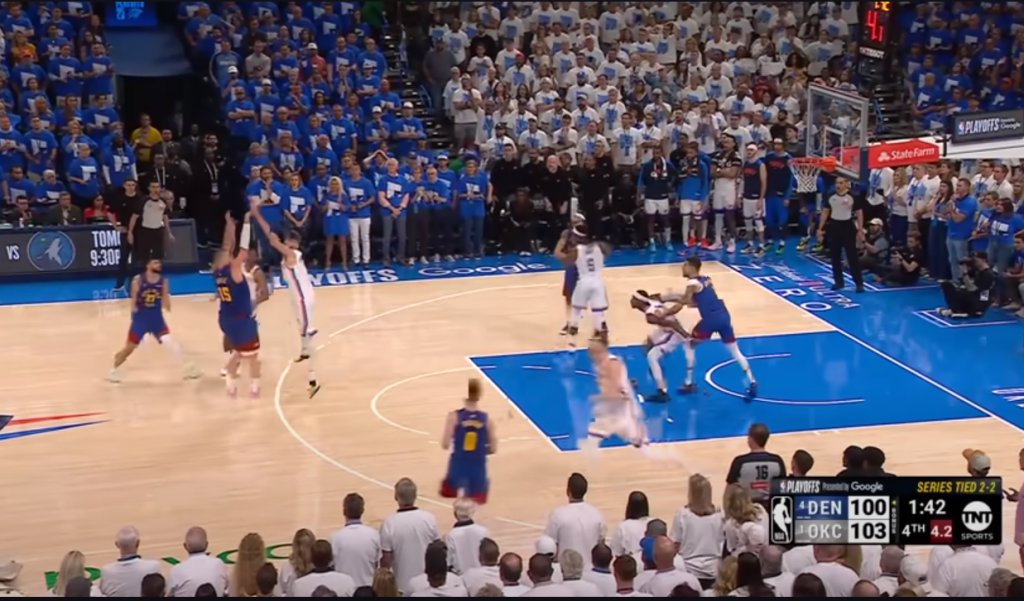 Με 44 πόντους σε 44:08 λεπτά συμμετοχής, ο Νίκολα Γιόκιτς τα έδωσε όλα, για τη νίκη των Νάγκετς, όμως, η ομάδα του Ντένβερ έχασε 112-105 στην Οκλαχόμα, από τη Θάντερ, και, στην επόμενη ήττα, αποκλείεται από τους τελικούς της Δύσης.