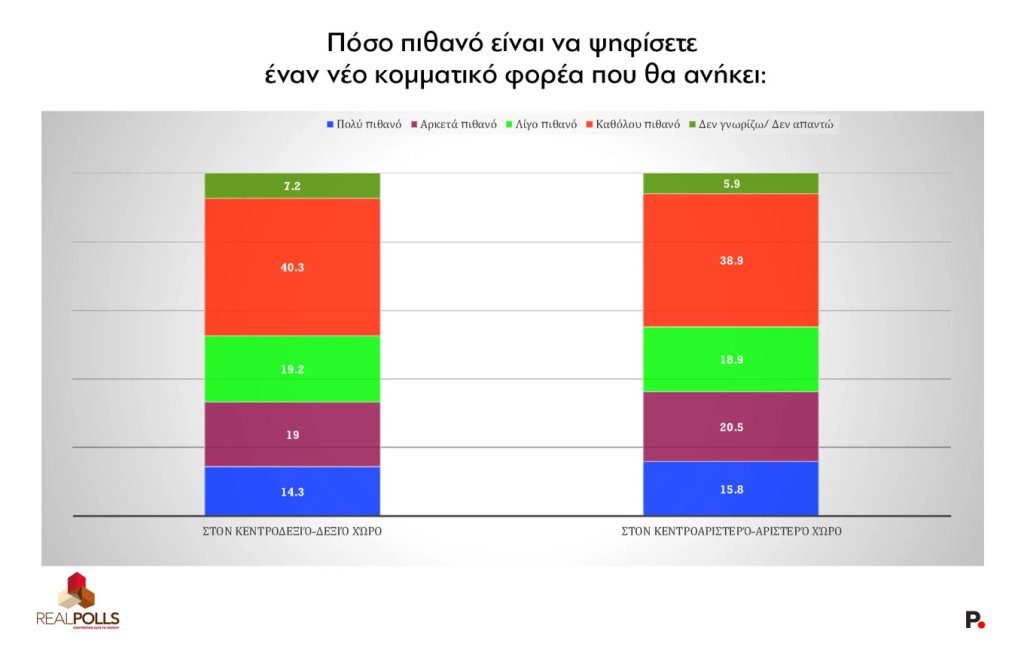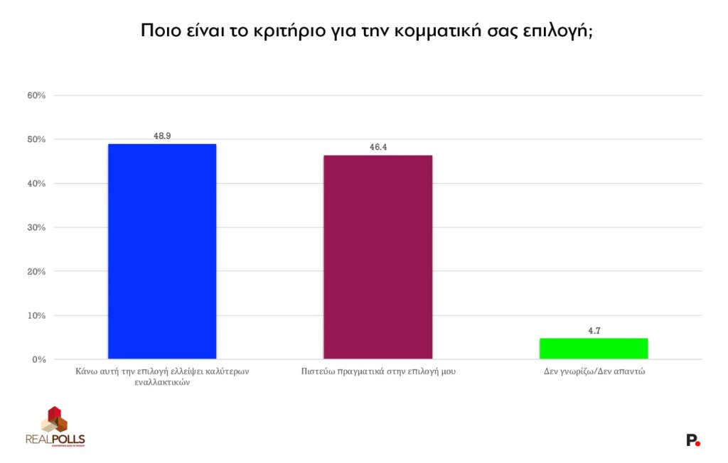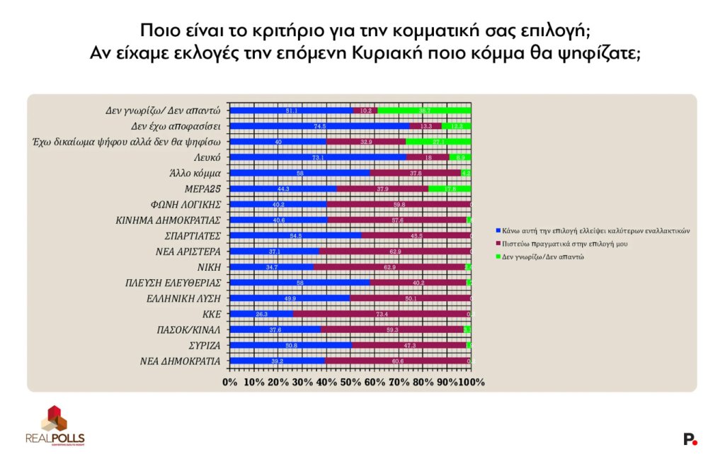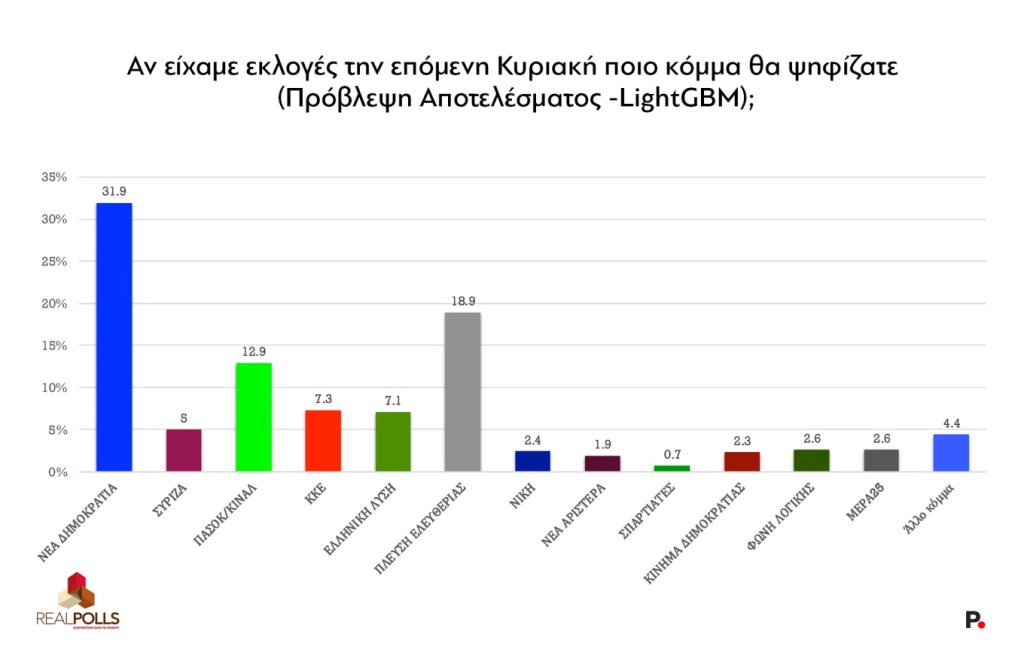Στην εκτίμηση ψήφου τα αντίστοιχα ποσοστά διαμορφώνονται ως εξής: Νέα Δημοκρατία 31,9%, Πλεύση Ελευθερίας 18,9%, ΚΚΕ 7,3%, Ελληνική Λύση 7,1%, ΣΥΡΙΖΑ 5%, ΜέΡΑ25 2,6%, Φωνή Λογικής 2,6%, Νίκη 2,4%, Κίνημα Δημοκρατίας 2,3%, Νέα Αριστερά 1,9%, Σπαρτιάτες 0,7%.