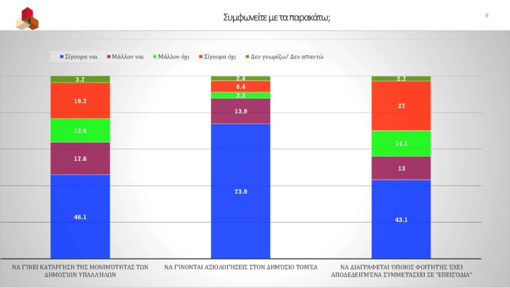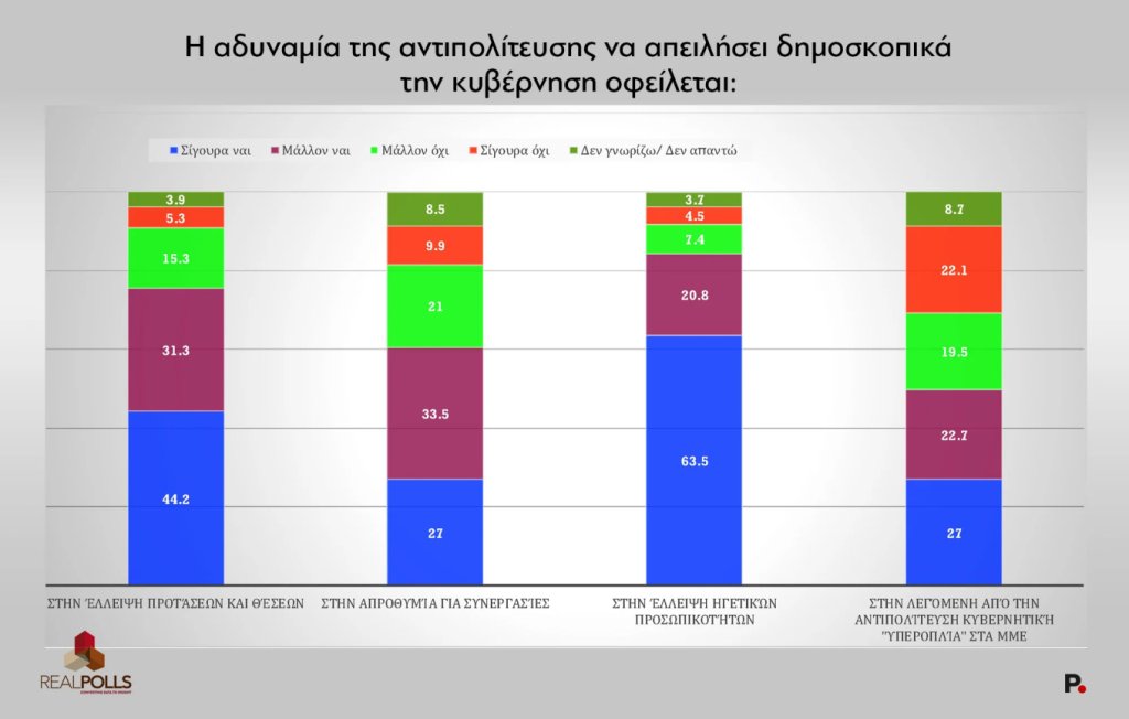 Στο ερώτημα για το ποιο κόμμα θα ψηφίζατε αν όλα είχαν διαφορετικό αρχηγό, το πιο προσωποκεντρικό αναδεικνύεται το κόμμα της Ζωής Κωνσταντοπούλου, ενώ εντυπωσιακή είναι και η προτίμηση των ψηφοφόρων σε άλλο πρόσωπο για την ηγεσία του ΠΑΣΟΚ. Αξίζει να σημειωθεί ότι σχεδόν ένας δύο (45,4%) θεωρεί ότι για το ΠΑΣΟΚ θα ήταν επιτυχία αν βγει δεύτερο στις επόμενες εκλογές.