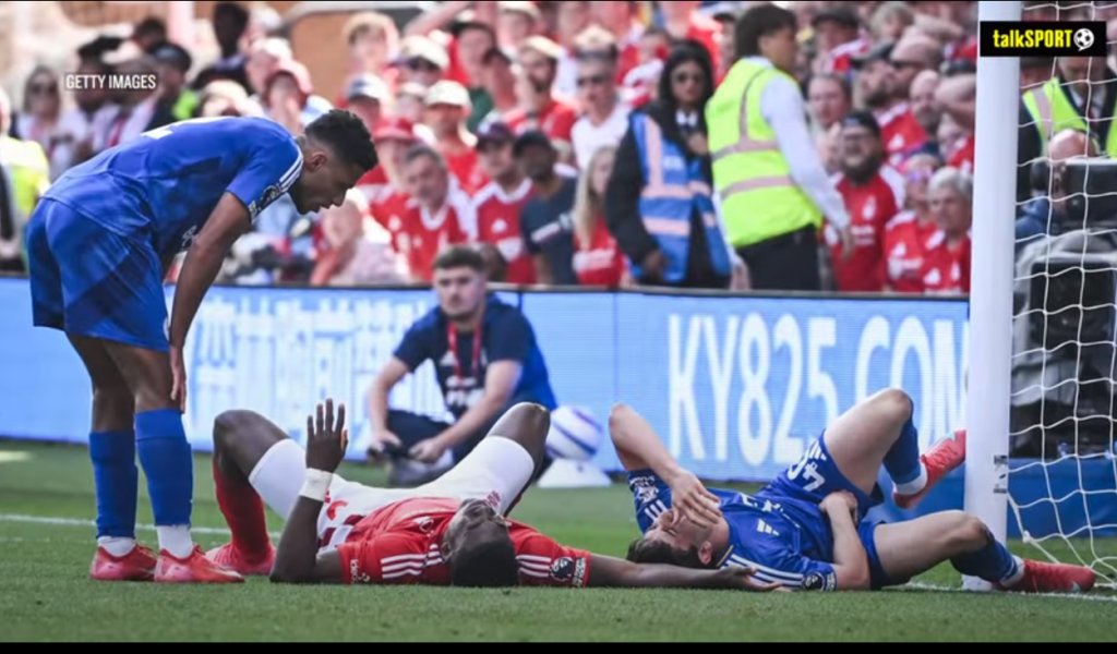 Video of Taiwo Awoniyi colliding with the goalpost in the 88th minute, during a match against Leicester City.