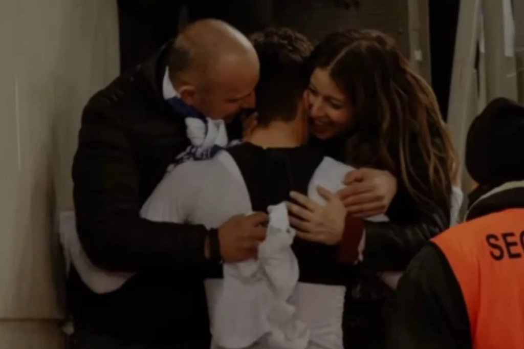 Τα πρώτα πλάνα είναι η αγκαλιά του Κωνσταντίνου Καρέτσα, με τους γονείς του, λίγα λεπτά μετά το ντεμπούτο του νεαρού άσου με τη γαλανόλευκη φανέλα.