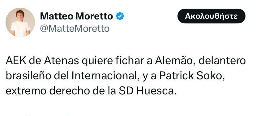 «Η ΑΕΚ θέλει να αποκτήσει τον Αλεμάο, έναν Βραζιλιάνο επιθετικό από την Ιντερνασιονάλ, και τον Πατρικ Σοκο, δεξιό εξτρέμ από την Ουέσκα. Ο Πάτρικ Σόκο βρίσκεται επίσης σε συνομιλίες με την Αλμερία», αναφέρρει συγκεκριμένα το ποστ του Μορέτο στο Χ.