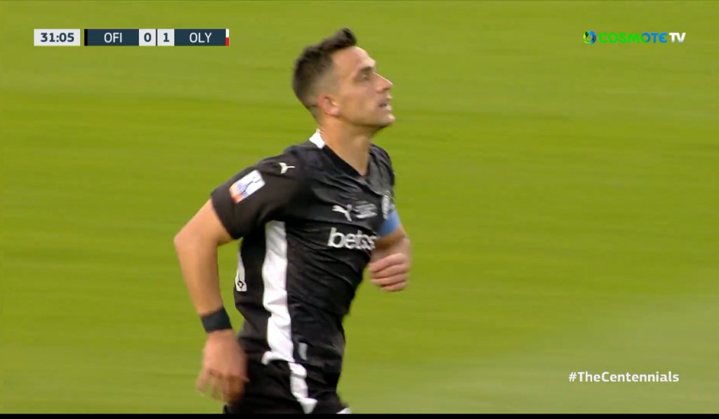 Στο 31ο λεπτό καταγράφεται η πρώτη ευκαιρία του ΟΦΗ στον τελικό. Ο Φούντας εκτέλεσε, ο Λαμπρόπουλος πήρε την κεφαλιά και η μπάλα πέρασε λίγο πάνω από το οριζόντιο δοκάρι.