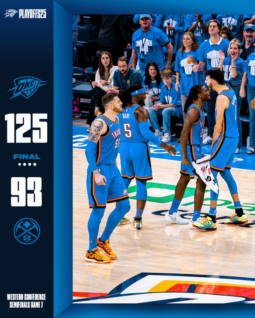 Για πρώτη φορά μετά το 2016, η Θάντερ θα βρεθεί στους τελικούς της Δύσης, αφού έκανε το 4-3 στη σειρά με τους Ντένβερ Νάγκετς. Η ομάδα της Οκλαχόμα, η οποία απέκτησε το απόλυτο πλεονέκτημα έδρας στην κανονική περίοδο, με ρεκόρ 68-14, επιβλήθηκε 125-93 στο Game 7 και, στους τελικούς, θα αντιμετωπίσει τους Μινεσότα Τίμπεργουλβς.