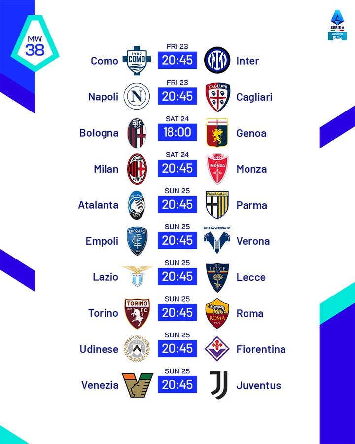 Το ερχόμενο Σαββατοκύριακο (24-25/5) το Ιταλικό πρωτάθλημα ρίχνει... αυλαία, με την μάχη του πρωταθλητή να είναι ακόμα ανοιχτή και τη Νάπολι να κρατάει την τύχη στα «χέρια» της. Η Ίντερ έκανε αίτημα για διεξαγωγή της τελευταίας αγωνιστικής την Πέμπτη (22/5) λόγω του τελικού του Champions League το μεθεπόμενο Σάββατο (31/5), κάτι που δεν έγινε δεκτό με το Κόμο-Ίντερ και Νάπολι-Κάλιαρι να ορίζονται για την Παρασκευή (23/5) στις 21:45, ενώ εάν υπάρξει ισοβαθμία και χρειαστεί να γίνει αγώνας μπαράζ τη Δευτέρα 26/5.