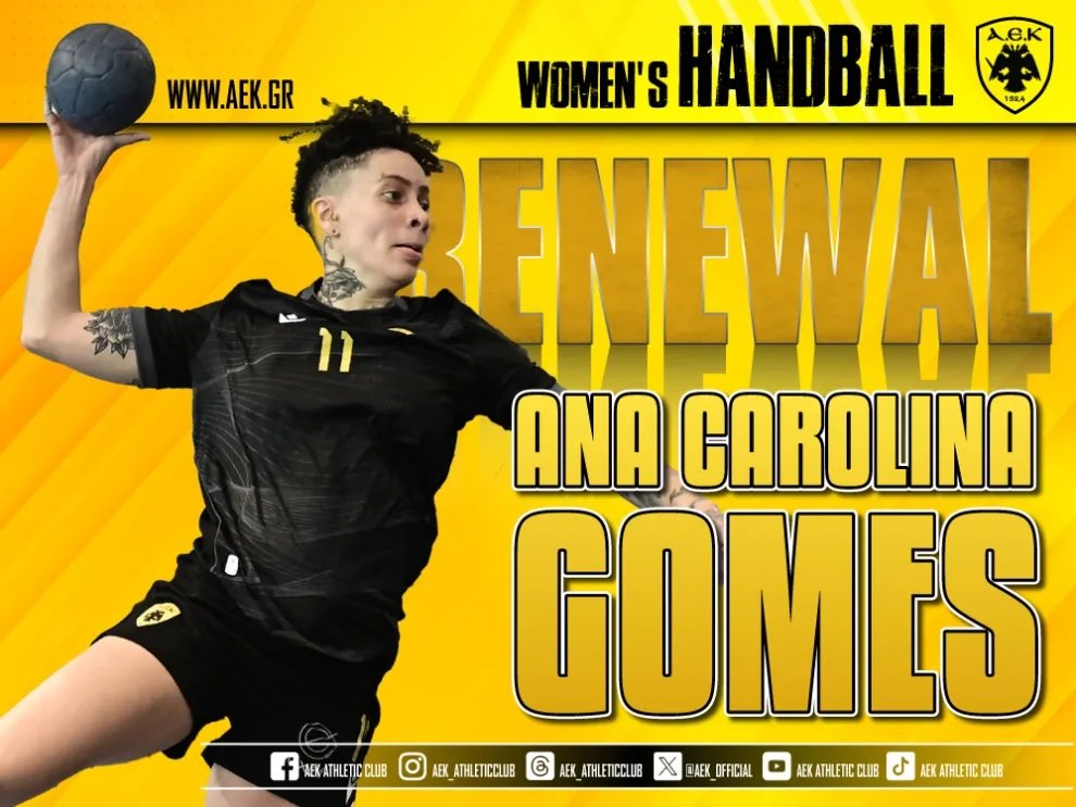 Η ΑΕΚ βρίσκεται στην ευχάριστη θέση να ανακοινώσει την ανανέωση της συνεργασίας της με την Άννα Καρολίνα Γκόμες. Η διεθνής Βραζιλιάνα αθλήτρια θα ενισχύσει και τη νέα σεζόν το τμήμα του Χάντμπολ Γυναικών της ομάδας μας.