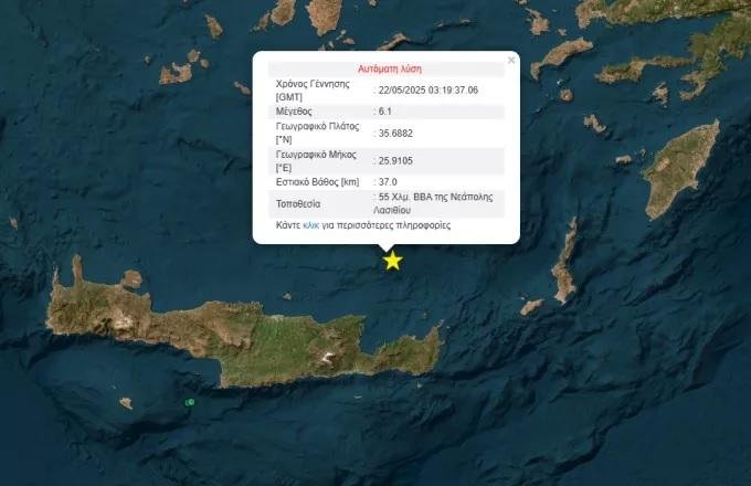 Ισχυρή σεισμική δόνηση μεγέθους 6,1 βαθμών της κλίμακας Ρίχτερ σημειώθηκε το πρωί της Πέμπτης με επίκεντρο στον θαλάσσιο χώρο 57 χλμ. Βόρεια βορειοανατολικά της Νεάπολης Λασιθίου.