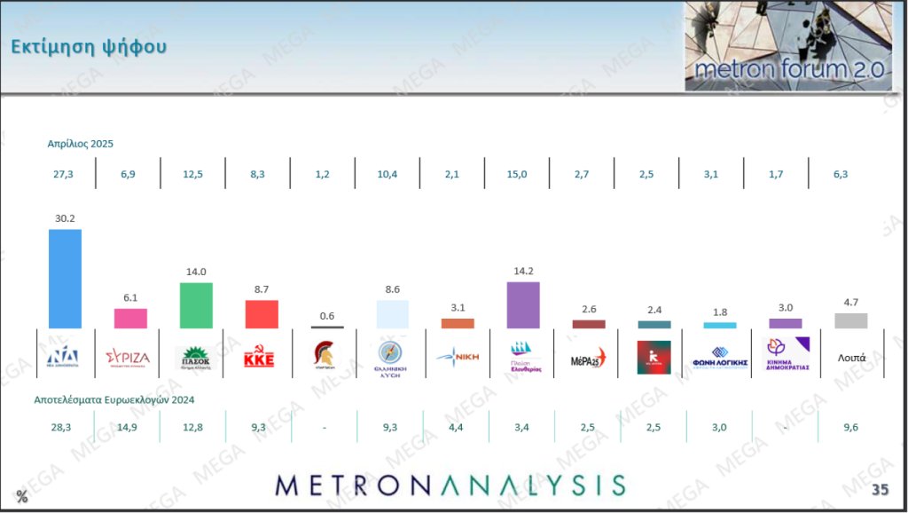 Σημαντικά κέρδη 2,9 μονάδων στην εκτίμηση ψήφου σε σχέση με τον Απρίλιο καταγράφει η ΝΔ στη μέτρηση της Metron Analysis που παρουσιάστηκε στο κεντρικό δελτίο του Mega. Την ίδια στιγμή , η Πλεύση Ελευθερίας χάνει 0,8 της μονάδας με αποτέλεσμα να προηγείται οριακά του ΠΑΣΟΚ που κερδίζει 1,5 μονάδα και επιστρέφει στο 14% στην εκτίμηση ψήφου, μόλις 0,2 της μονάδας πίσω από το κόμμα της Ζωής Κωνσταντοπούλου.