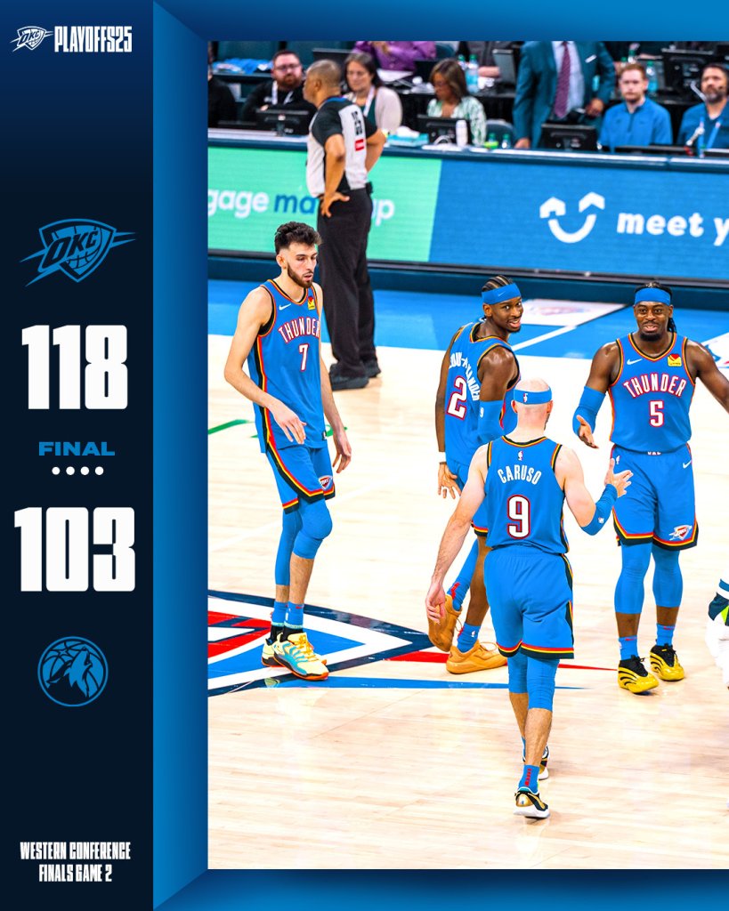 Μια μέρα αφότου αναδείχθηκε MVP της εφετινής σεζόν, ο Σάι Γκίλτζιους-Αλεξάντερ έβαλε 38 πόντους και συνέβαλε τα μέγιστα, ώστε η Οκλαχόμα Σίτι Θάντερ να νικήσει 118-103 τους Μινεσότα Τίμπεργουλβς και να κάνει το 2-0 στους τελικούς της Δύσης.