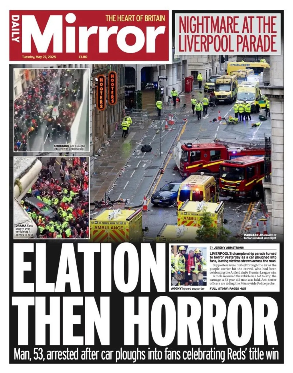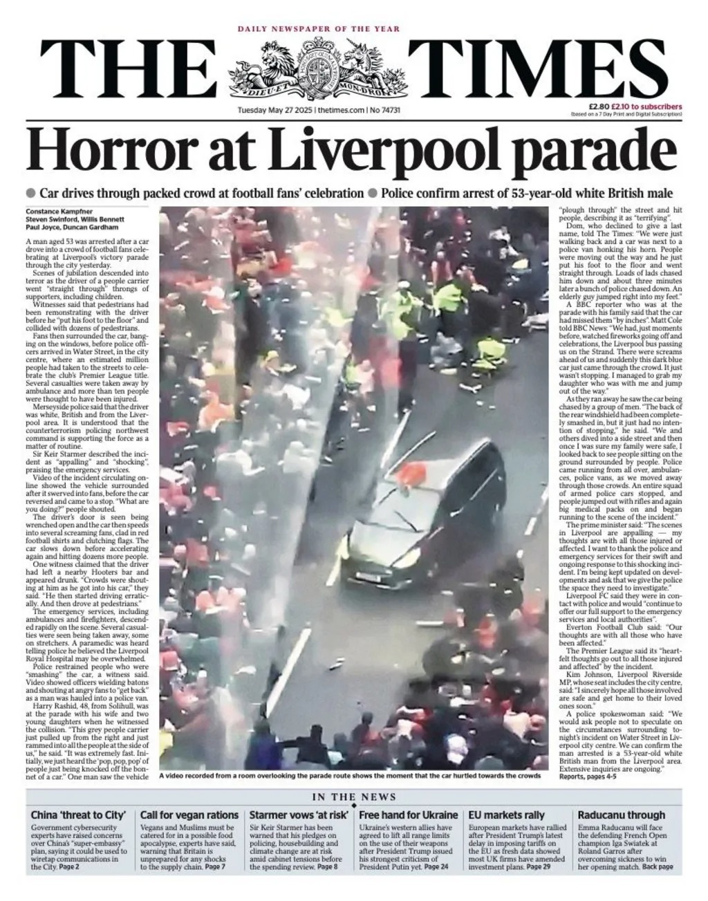 Ο Guardian αναφέρει στο πρωτοσέλιδό του: “Τρόμος όταν ένα αυτοκίνητο όρμησε στον κόσμο στην παρέλαση της Λίβερπουλ”.
