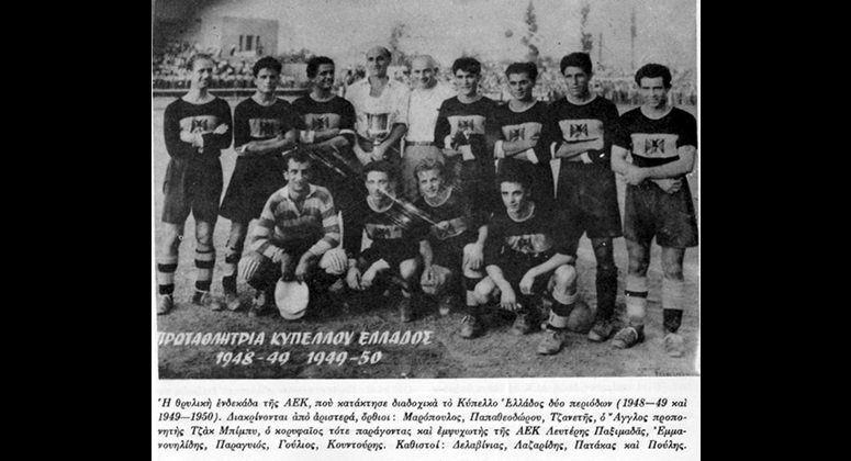 Στη φωτογραφία, η Κυπελλούχος Ελλάδας 1950 η ΑΕΚ που ποζάρει με την εξής σύνθεση: όρθιοι από τα αριστερά προς τα δεξιά οι Δελαβίνιας, Πούλης, Ηλίας Παπαγεωργίου, Κανάκης, Κουντούρης, Παραγιός, Εμμανουηλίδης, Λαζαρίδης, Καλυβόπουλος. Καθιστοί οι Τζανετής, Μαρόπουλος, Παπαθεοδώρου και Γούλιος