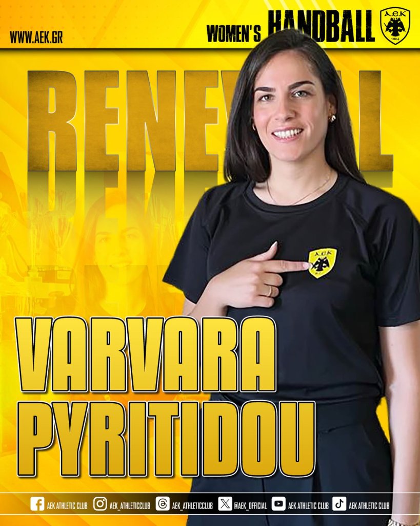 Η ΑΕΚ βρίσκεται στην ευχάριστη θέση να ανακοινώσει την ανανέωση της συνεργασίας της με την Βαρβάρα Πυριτίδου. Η Ελληνίδα τερματοφύλακας, ύψους 1,73 μ., θα ενισχύσει και τη νέα σεζόν το τμήμα Χάντμπολ Γυναικών της ΑΕΚ.