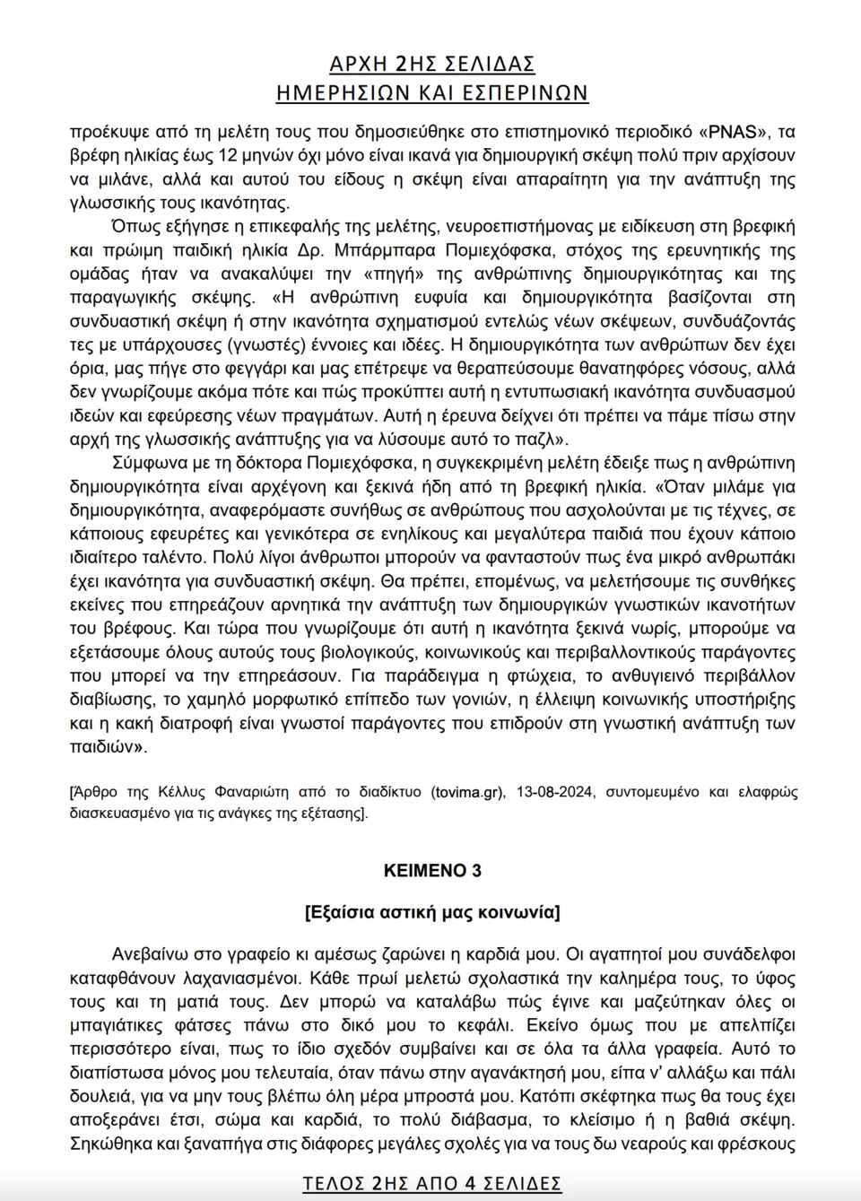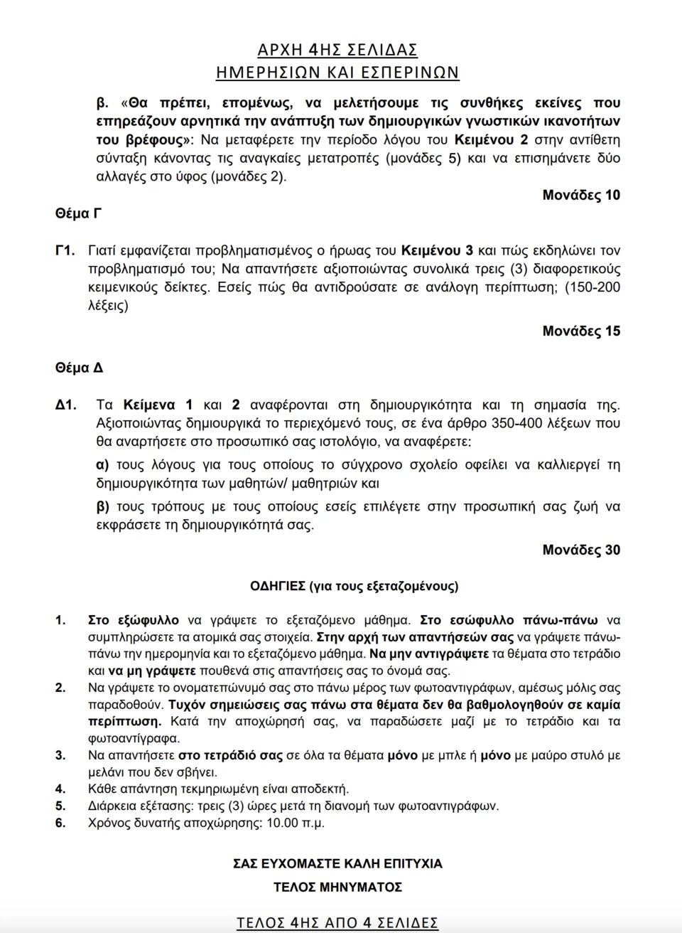 Αναλυτικότερα, οι υποψήφιοι, πέραν των ερωτήσεων συντακτικού, λεξιλογίου και ερμηνείας, κλήθηκαν να γράψουν ένα άρθρο για το προσωπικό τους ιστολόγιο, 350-400 λέξεων, όπου θα αναφέρονται οι λόγοι για τους οποίους το σύγχρονο σχολείο οφείλει να καλλιεργεί τη δημιουργικότητα των μαθητών/μαθητριών και οι τρόποι με τους οποίους οι ίδιοι επιλέγουν στην προσωπική τους ζωή να εκφράσουν τη δημιουργικότητά τους.