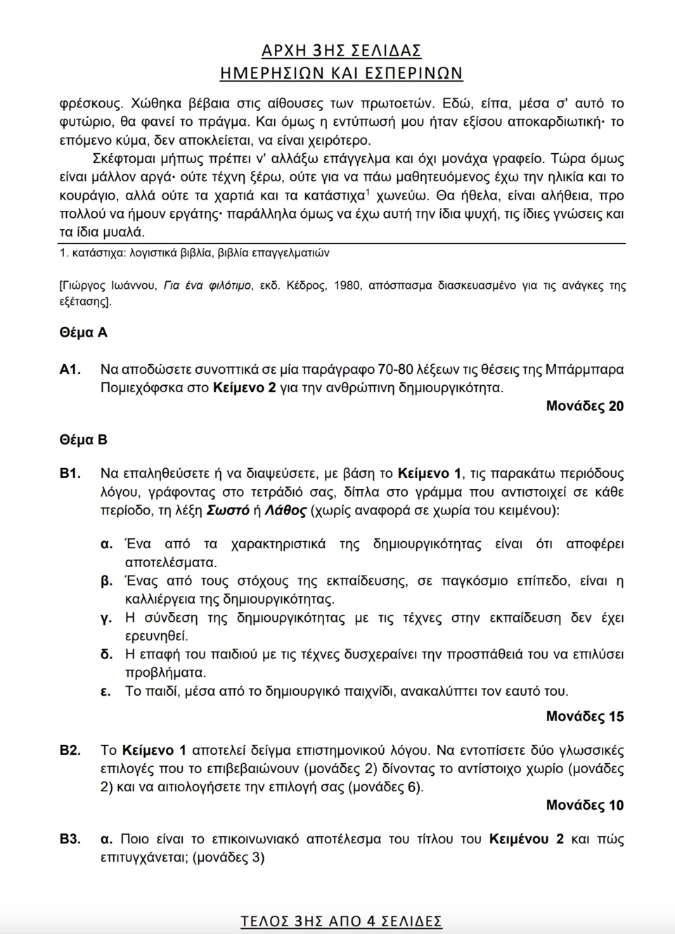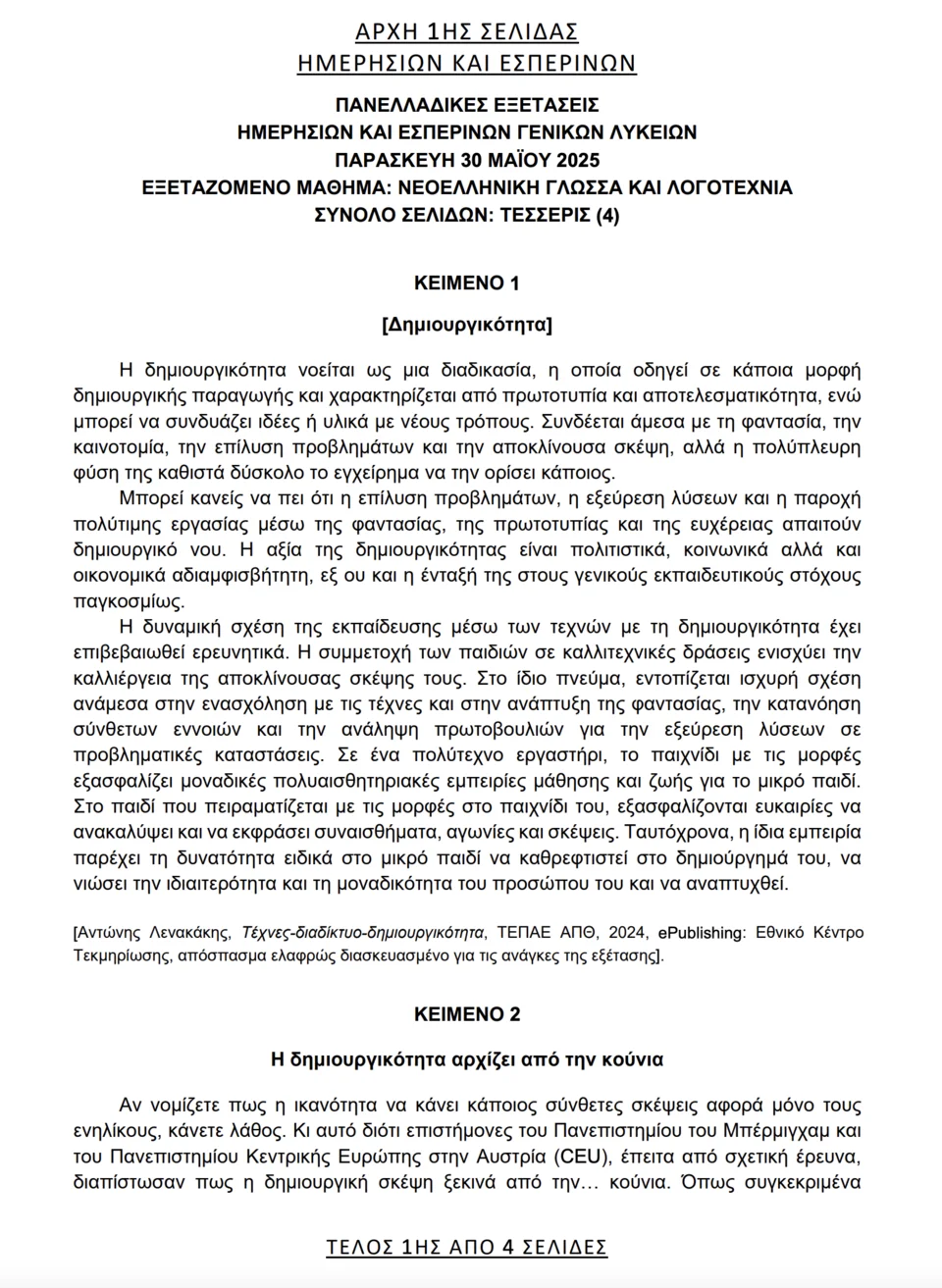 Το θέμα της δημιουργικότητας και της σημασίας της κλήθηκαν να αναλύσουν οι υποψήφιοι των Πανελλαδικών των ΓΕΛ, κατά τη σημερινή, πρώτη ημέρα εξετάσεων, στο μάθημα της Νεοελληνικής Γλώσσας και Λογοτεχνίας.