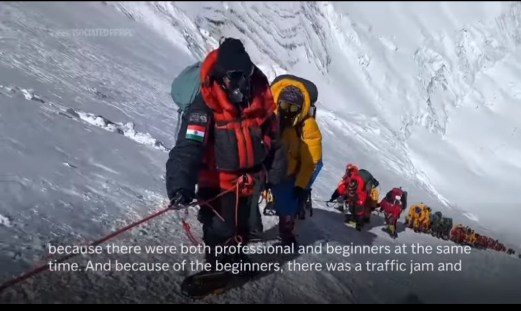 Πολλοί ορειβάτες, θέλοντας πάση θυσία να «κατακτήσουν» το Έβερεστ, δέθηκαν στο σχοινί ασφαλείας που υπάρχει στο βουνό προκαλώντας το γνωστό φαινόμενο «κυκλοφοριακή συμφόρηση του Έβερεστ».