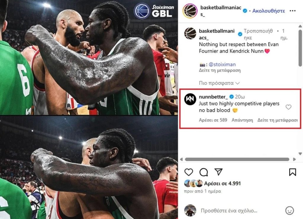 Ο Κέντρικ Ναν σχολίασε μέσω Instagram μία ανάρτηση που έδειχνε την αγκαλιά του με τον Εβάν Φουρνιέ μετά το φινάλε του Game 4 των τελικών του Ολυμπιακού με τον Παναθηναϊκό AKTOR, τονίζοντας ότι δεν υπάρχει καμία κόντρα με τον Γάλλο.