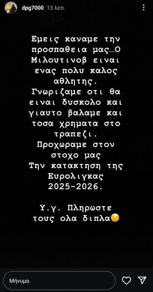 Μετά και από αυτή την εξέλιξη, ο Δημήτρης Γιαννακόπουλος έκανε την ακόλουθη ανάρτηση: "Εμείς κάναμε την προσπάθειά μας… Ο Μιλουτίνοβ είναι ένας πολύ καλός αθλητής. Γνωρίζαμε ότι θα είναι δύσκολο για αυτό βάλαμε και τόσα χρήματα στο τραπέζι. Προχωράμε στον στόχο μας. Την κατάκτηση της Ευρωλίγκας 2025/26.
