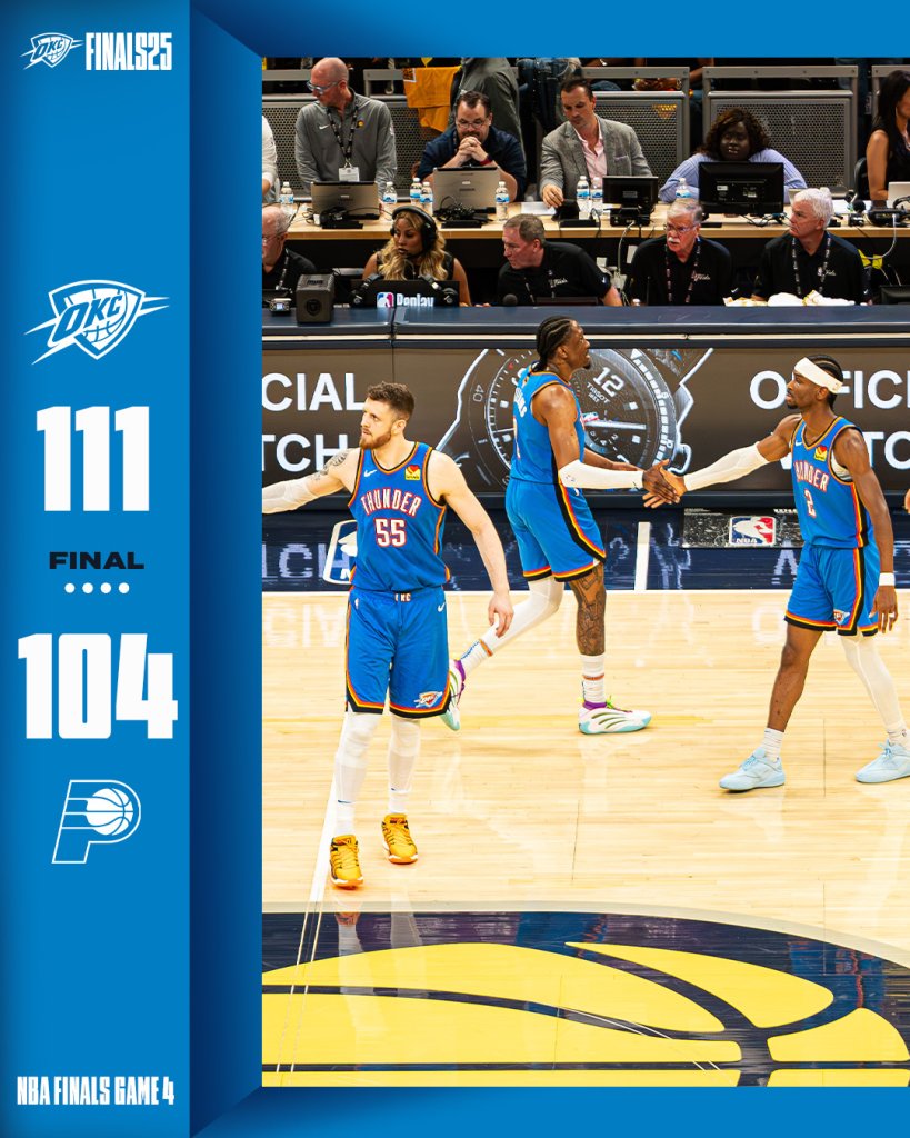 Ο Σάι Γκίλτζιους-Αλεξάντερ τελείωσε το Game 4 με μηδέν ασίστ και ένα εύστοχο τρίποντο, αλλά, στο τέλος υπήρξε καθοριστικός. Συνολικά, ο Καναδός γκαρντ έβαλε 35 πόντους (11/20 δίποντα, 1/4 τρίποντα, 10/10 βολές), με τον Τζέιλεν Γουίλιαμς να σημειώνει 27 πόντους (8/18 σουτ). Ο Τσετ Χόλμγκρεν είχε νταμπλ-νταμπλ (14 πόντοι, 15 ριμπάουντ) και ο Άλεξ Καρούζο προσέφερε 20 πόντους (7/9 σουτ) στη νίκη της Θάντερ.