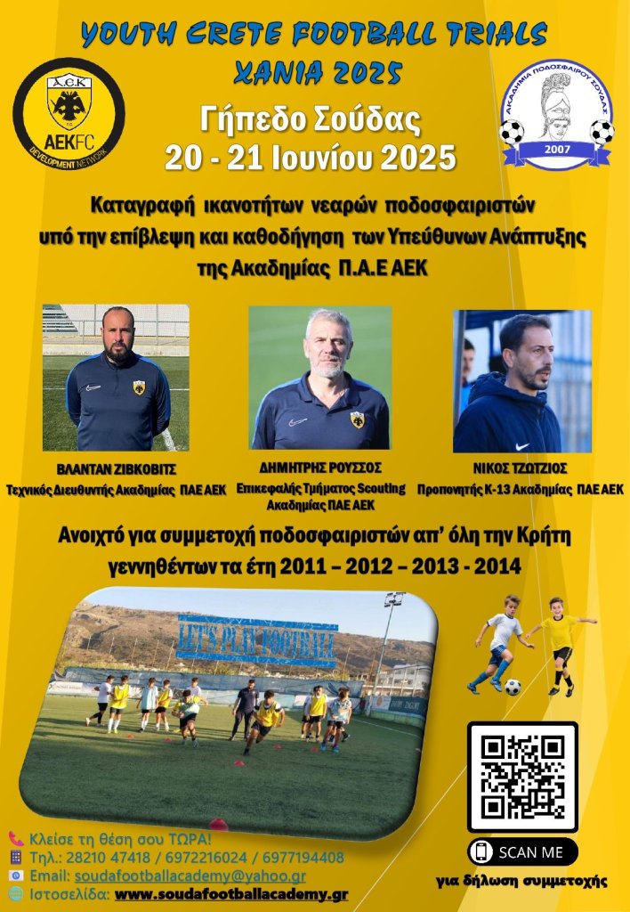 Ελεύθερα δοκιμαστικά για παιδιά από όλη την Κρήτη, γεννημένα τα έτη 2011, 2012, 2013 και 2014, διοργανώνει στα Χανιά το διήμερο 20-21 Ιουνίου η Ακαδημία Ποδοσφαίρου Σούδας, μέλος του Δικτύου Ακαδημιών της ΑΕΚ.