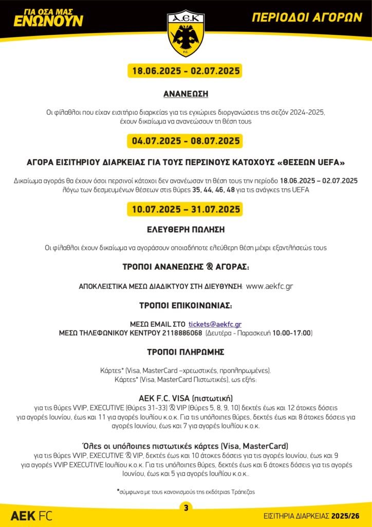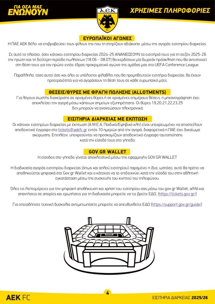 Τα εισιτήρια διαρκείας για το Πρωτάθλημα και το Κύπελλο Ελλάδας κυκλοφορούν ακριβώς στις ίδιες τιμές με αυτές της περιόδου 2024-2025. Επιπλέον, όσοι κάτοχοι εισιτηρίου διαρκείας 2024-25 ΑΝΑΝΕΩΣΟΥΝ τα εισιτήριά τους για τη σεζόν 2025-26 την πρώτη και τη δεύτερη περίοδο πωλήσεων (18.06 – 08.07) θα κερδίσουν μία δωρεάν πρόσκληση που θα αντιστοιχεί στη θέση τους για τον πρώτο εντός έδρας προκριματικό αγώνα της ομάδας μας στο UEFA Conference League.