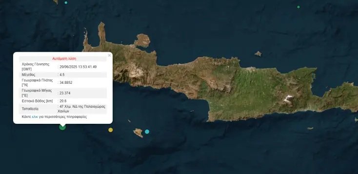 Σεισμός μεγέθους 4,5 Ρίχτερ σημειώθηκε ανοικτά των Χανίων λίγα λεπτά πριν από τις 17.00 της Παρασκευής (20.06).