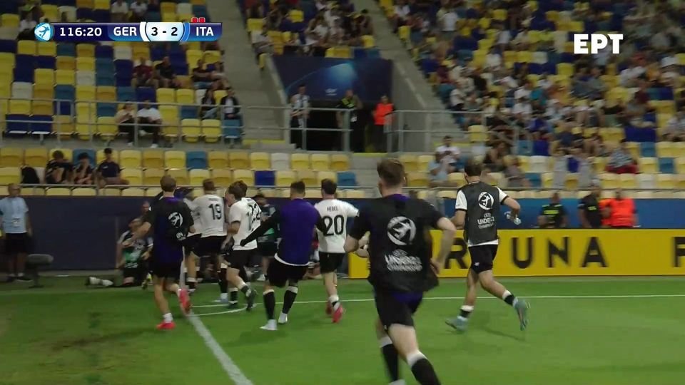 Στην παράταση, η Γερμανία νίκησε 3-2 τη Γαλλία και έγινε η τελευταία, χρονικά, ομάδα που πέρασε στα ημιτελικά του EURO U-21. Οι Ιταλοί έχασαν μεγάλη ευκαιρία να ανοίξουν το σκορ, στο 56ο λεπτό, όταν ο Νιόντο βρέθηκε τετ α τετ με τον Γερμανό γκολκίπερ, τον Ατουμπόλου, αλλά δεν κατάφερε να στείλει την μπάλα στα δίχτυα. Δυο λεπτά μετά, η Ιταλία έκανε το 1-0, χάρη σε τέρμα του Κολεόσο, ο οποίος συνέκλινε από τα αριστερά και, με εξαιρετικό διαγώνιο σουτ, έβαλε μπροστά στο σκορ τους Ιταλούς. Στο 68', η Γερμανία ισοφάρισε με δυνατή κεφαλιά του Βολτεμάντε, μετά από εκτέλεση κόρνερ, ενώ, στο 80', η Ιταλία έμεινε με δέκα παίκτες, λόγω αποβολής, με δεύτερη κίτρινη, του Νιόντο. Επτά λεπτά αργότερα, η Γερμανία προηγήθηκε με τον Βάιπερ και, στο 90', η Ιταλία βρέθηκε με εννέα παίκτες, αφού αποβλήθηκε και ο Τσανότι. Όμως, στο έκτο λεπτό των καθυστερήσεων, οι Ιταλοί κατάφεραν να στείλουν το ματς στην παράταση, χάρη σε γκολ του Αμπροζίνο, με απευθείας εκτέλεση φάουλ. Τρία λεπτά πριν από το τέλος του έξτρα ημιώρου, στο 117', ο Ρελ, με δυνατό σουτ, χάρισε τη νίκη στη Γερμανία, που, με το τελικό 3-2, προκρίθηκε στα ημιτελικά.