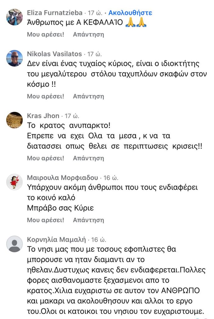 Η κίνηση του Μάριου Ηλιόπουλου να μεταφέρει μέσω της Seajets στη Χίο ισχυρές πυροσβεστικές δυνάμεις για την κατάσβεση της τεράστιας φωτιάς που κατέστρεφε το νησί, έχει φέρει κύμα ευχαριστιών από απλούς ανθρώπους. Εκατοντάδες τα σχόλια κατοίκων του νησιού και όχι μόνο για τον διοικητικό ηγέτη της ΑΕΚ για την κίνηση ανθρωπιάς. Μια κίνηση προφανώς που για τον Μάριο Ηλιόπουλο, ως άνθρωπο, είναι αυτονόητη καθώς πάντοτε βρίσκεται δίπλα στον συνάνθρωπο, στηρίζιε όλα τα μέρη της Ελλάδας και θυμίζουμε πως είχε συνδάμει πολύ ενεργά και τις φονικές φωτιές στο Μάτι. Δείτε μερικά από τα εκατοντάδες σχόλια για τον Μάριο Ηλιόπουλο.