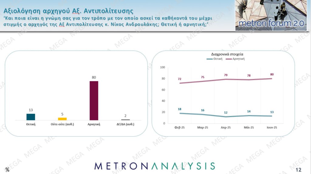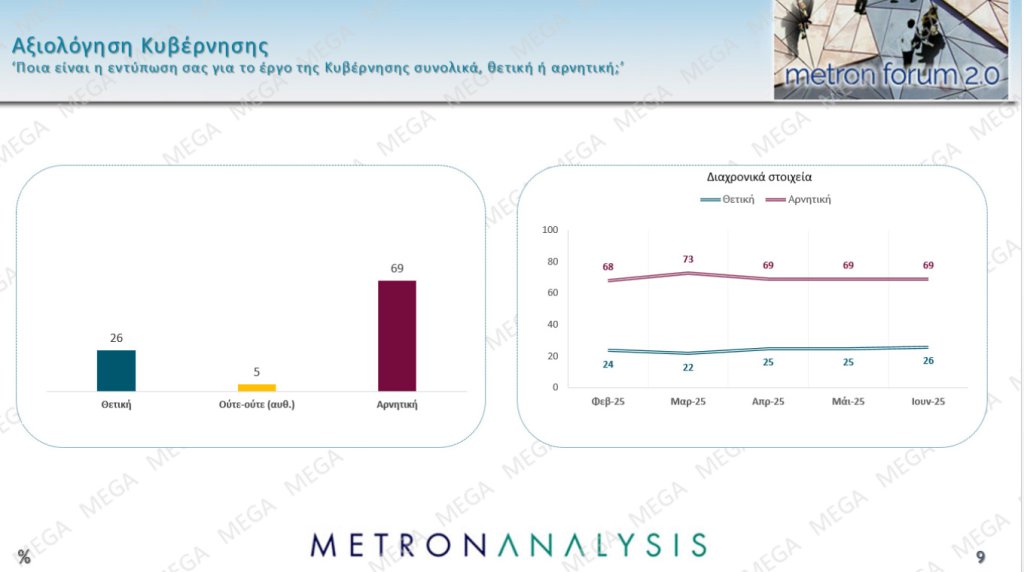Την ίδια στιγμή, η αξιολόγηση για το έργο της κυβέρνησης είναι αρνητική κατά 69% και η αξιολόγηση του πρωθυπουργό συγκεκριμένα συγκεντρώνει αρνητικό ποσοστό 67%. Πολύ πιο αρνητική είναι η άποψη για την αντιπολίτευση του ΠΑΣΟΚ που φτάνει στο 83% και του Νίκου Ανδρουλάκη συγκεκριμένα που φτάνει στο 80%.